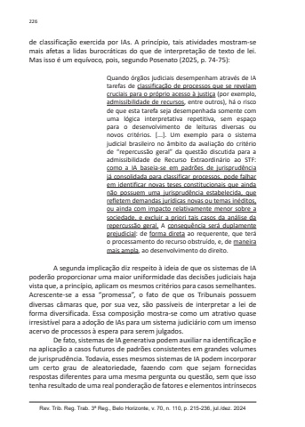Rev. Trib. Reg. Trab. 3ª Reg., Belo Horizonte, v. 70, n. 110, p. 215-236, jul./dez. 2024226de classificação exercida por IAs. A princípio, tais atividades mostram-se mais afetas a lidas burocráticas do que de interpretação de texto de lei. Mas isso é um equívoco, pois, segundo Posenato (2025, p. 74-75):Quando órgãos judiciais desempenham através de IA tarefas de classificação de processos que se revelam cruciais para o próprio acesso à justiça (por exemplo, admissibilidade de recursos, entre outros), há o risco de que esta tarefa seja desempenhada somente com uma lógica interpretativa repetitiva, sem espaço para o desenvolvimento de leituras diversas ou novos critérios. [...]. Um exemplo para o sistema judicial brasileiro no âmbito da avaliação do critério de “repercussão geral” da questão discutida para a admissibilidade de Recurso Extraordinário ao STF: como a IA baseia-se em padrões de jurisprudência já consolidada para classificar processos, pode falhar em identificar novas teses constitucionais que ainda não possuem uma jurisprudência estabelecida, que refletem demandas jurídicas novas ou temas inéditos, ou ainda com impacto relativamente menor sobre a sociedade, e excluir a priori tais casos da análise da repercussão geral. A consequência será duplamente prejudicial: de forma direta ao requerente, que terá o processamento do recurso obstruído, e, de maneira mais ampla, ao desenvolvimento do direito.A segunda implicação diz respeito à ideia de que os sistemas de IA poderão proporcionar uma maior uniformidade das decisões judiciais haja vista que, a princípio, aplicam os mesmos critérios para casos semelhantes. Acrescente-se a essa “promessa”, o fato de que os Tribunais possuem diversas câmaras que, por sua vez, são passíveis de interpretar a lei de forma diversificada. Essa composição mostra-se como um atrativo quase irresistível para a adoção de IAs para um sistema judiciário com um imenso acervo de processos à espera para serem julgados.De fato, sistemas de IA generativa podem auxiliar na identificação e na aplicação a casos futuros de padrões consistentes em grandes volumes de jurisprudência. Todavia, esses mesmos sistemas de IA podem incorporar um certo grau de aleatoriedade, fazendo com que sejam fornecidas respostas diferentes para uma mesma pergunta ou questão, sem que isso tenha resultado de uma real ponderação de fatores e elementos intrínsecos