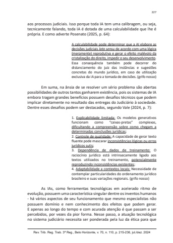 Rev. Trib. Reg. Trab. 3ª Reg., Belo Horizonte, v. 70, n. 110, p. 215-236, jul./dez. 2024227aos processos judiciais. Isso porque toda IA tem uma calibragem, ou seja, tecnicamente falando, toda IA é dotada de uma calculabilidade que lhe é própria. E como adverte Posenato (2025, p. 64):A calculabilidade pode determinar que a AI elabore as decisões judiciais lato sensu de acordo com uma lógica (meramente) reprodutiva e gerar o efeito malévolo da cristalização do direito, impedir o seu desenvolvimento. Essa consequência também pode decorrer do distanciamento do juiz das instâncias e sugestões concretas do mundo jurídico, em caso de utilização exclusiva da IA para a tomada de decisões. (grifo nosso)Em suma, na ânsia de se resolver um sério problema são abertas possibilidades de outros tantos ganharem existência, pois os sistemas de IA embora tragam grandes benefícios possuem desafios técnicos que podem implicar diretamente no resultado das entregas do Judiciário à sociedade. Dentre esses desafios podem ser destacados, segundo Vale (2024, p. 7):1. Explicabilidade limitada: Os modelos generativos funcionam como “caixas-pretas” complexas, dificultando a compreensão sobre como chegam a determinadas conclusões jurídicas;2. Controle de qualidade: A capacidade de gerar texto fluente pode mascarar inconsistências lógicas ou erros jurídicos sutis;3. Dependência de dados de treinamento: O raciocínio jurídico está intrinsecamente ligado aos textos utilizados no treinamento, potencialmente reproduzindo inconsistências existentes;4. Adaptabilidade a contextos locais: Necessidade de contemplar particularidades do ordenamento jurídico brasileiro e suas variações regionais. (grifo nosso)As IAs, como ferramentas tecnológicas em acelerado ritmo de evolução, possuem uma característica singular dentre os inventos humanos - há vários aspectos de seu funcionamento que mesmo especialistas não possuem domínio e nem conhecimento dos efeitos que podem gerar. E apenas ao longo do tempo e com acurada atenção é que passam a ser percebidos, por vezes da pior forma. Nesse passo, a atuação tecnológica no sistema judiciário necessita ser ponderada pela luz da ética para que