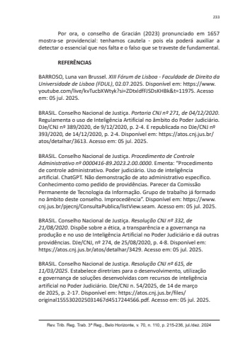 Rev. Trib. Reg. Trab. 3ª Reg., Belo Horizonte, v. 70, n. 110, p. 215-236, jul./dez. 2024233Por ora, o conselho de Gracián (2023) pronunciado em 1657 mostra-se providencial: tenhamos cautela - pois ela poderá auxiliar a detectar o essencial que nos falta e o falso que se traveste de fundamental.REFERÊNCIASBARROSO, Luna van Brussel. XIII Fórum de Lisboa - Faculdade de Direito da Universidade de Lisboa (FDUL), 02.07.2025. Disponível em: https://www.youtube.com/live/kvTucbXWtyk?si=ZDtxldfFJSDsKHBk&t=11975. Acesso em: 05 jul. 2025.BRASIL. Conselho Nacional de Justiça. Portaria CNJ nº 271, de 04/12/2020. Regulamenta o uso de Inteligência Artificial no âmbito do Poder Judiciário. DJe/CNJ nº 389/2020, de 9/12/2020, p. 2-4. E republicada no DJe/CNJ nº 393/2020, de 14/12/2020, p. 2-4. Disponível em: https://atos.cnj.jus.br/atos/detalhar/3613. Acesso em: 05 jul. 2025.BRASIL. Conselho Nacional de Justiça. Procedimento de Controle Administrativo nº 0000416-89.2023.2.00.0000. Ementa: “Procedimento de controle administrativo. Poder judiciário. Uso de inteligência artificial. ChatGPT. Não demonstração de ato administrativo específico. Conhecimento como pedido de providências. Parecer da Comissão Permanente de Tecnologia da Informação. Grupo de trabalho já formado no âmbito deste conselho. Improcedência”. Disponível em: https://www.cnj.jus.br/pjecnj/ConsultaPublica/listView.seam. Acesso em: 05 jul. 2025.BRASIL. Conselho Nacional de Justiça. Resolução CNJ nº 332, de 21/08/2020. Dispõe sobre a ética, a transparência e a governança na produção e no uso de Inteligência Artificial no Poder Judiciário e dá outras providências. DJe/CNJ, nº 274, de 25/08/2020, p. 4-8. Disponível em: https://atos.cnj.jus.br/atos/detalhar/3429. Acesso em: 05 jul. 2025.BRASIL. Conselho Nacional de Justiça. Resolução CNJ nº 615, de 11/03/2025. Estabelece diretrizes para o desenvolvimento, utilização e governança de soluções desenvolvidas com recursos de inteligência artificial no Poder Judiciário. DJe/CNJ n. 54/2025, de 14 de março de 2025, p. 2-17. Disponível em: https://atos.cnj.jus.br/files/original1555302025031467d4517244566.pdf. Acesso em: 05 jul. 2025.
