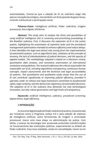 Rev. Trib. Reg. Trab. 3ª Reg., Belo Horizonte, v. 70, n. 110, p. 237-257, jul./dez. 2024238automatizadas. Conclui-se que a adoção da IA no Judiciário exige não apenas inovação tecnológica, mas também um forte aparato de governança, controle institucional e participação social.Palavras-chave: inteligência artificial; Poder Judiciário; triagem processual; ética digital; eficiência.A bstract: This study aims to analyze the limits and possibilities of using artificial intelligence (AI) in screening and prioritizing proceedings in the Brazilian Judiciary. First, it discusses the expansion of AI in the justice system, highlighting the automation of repetitive tasks and the procedural management optimization intended to enhance efficiency and reduce delays. It then identifies the legal and ethical risks arising from the implementation of automated systems, such as algorithmic bias, violations of the principle of isonomy, the lack of individualization of judicial decisions, and the opacity of applied models. The methodology adopted is based on a literature review, quantitative data analysis, and normative examination of international resolutions and guidelines. The research addresses the criteria required for the responsible use of AI, including algorithmic transparency, continuous human oversight, impact assessments and the technical and legal accountability of systems. This quantitative and qualitative study shows that the use of AI can contribute significantly to improving judicial efficiency, provided it operates under an ethical and legal framework committed to fundamental rights, legal certainty, and the democratic legitimacy of automated decisions. The adoption of AI in the Judiciary thus demands not only technological innovation, but also robust governance and high levels of transparency.Keywords: artificial intelligence; judiciary; procedural screening; digital ethics; legal efficiency.1 INTRODUÇÃOA crescente digitalização do Poder Judiciário brasileiro, impulsionada por iniciativas como o Programa Justiça 4.0 e pela adoção de sistemas de inteligência artificial, como ferramentas de triagem e priorização processual, marca uma nova etapa na administração da justiça. Com efeito, o avanço da tecnologia tem provocado profundas transformações no funcionamento das instituições públicas, especialmente no âmbito do Poder Judiciário. Essa nova realidade, ainda em consolidação, insere-se em