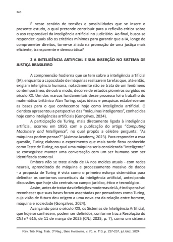 Rev. Trib. Reg. Trab. 3ª Reg., Belo Horizonte, v. 70, n. 110, p. 237-257, jul./dez. 2024240É nesse cenário de tensões e possibilidades que se insere o presente estudo, o qual pretende contribuir para a reflexão crítica sobre o uso responsável da inteligência artificial no Judiciário. Ao final, busca-se responder: quais são os critérios mínimos para garantir que a IA, longe de comprometer direitos, torne-se aliada na promoção de uma justiça mais eficiente, transparente e democrática?2 A INTELIGÊNCIA ARTIFICIAL E SUA INSERÇÃO NO SISTEMA DE JUSTIÇA BRASILEIROA compreensão hodierna que se tem sobre a inteligência artificial (IA), enquanto a capacidade de máquinas realizarem tarefas que, até então, exigiam inteligência humana, notadamente não se trata de um fenômeno contemporâneo, de outro modo, decorre de estudos pioneiros surgidos no século XX. Um dos marcos fundamentais desse processo foi o trabalho do matemático britânico Alan Turing, cujas ideias e pesquisas estabeleceram as bases para o que conhecemos hoje como inteligência artificial. O cientista apresentou a perspectiva das “máquinas inteligentes”, conhecidas hoje como inteligências artificiais (Gonçalves, 2024).A participação de Turing, mais diretamente ligada à inteligência artificial, ocorreu em 1950, com a publicação do artigo “Computing Machinery and Intelligence”, no qual propôs a célebre pergunta: “As máquinas podem pensar?” (Asimov Academy, 2023). Para responder a essa questão, Turing elaborou o experimento que mais tarde ficou conhecido como Teste de Turing, no qual uma máquina seria considerada “inteligente” se conseguisse manter uma conversação com um ser humano sem ser identificada como tal.Embora não se trate ainda de IA nos moldes atuais - com redes neurais, aprendizado de máquina e processamento massivo de dados - a proposta de Turing é vista como o primeiro esforço sistemático para delimitar os contornos conceituais da inteligência artificial, antecipando discussões que hoje são centrais no campo jurídico, ético e tecnológico.Assim, antes de tratar das definições modernas de IA, é indispensável reconhecer que suas bases foram assentadas por pensadores como Turing, cuja visão de futuro deu origem a uma nova era da relação entre homem, máquina e sociedade (Gonçalves, 2024).Avançando para o século XXI, os Sistemas de Inteligência Artificial, que hoje se conhecem, podem ser definidos, conforme traz a Resolução do CNJ nº 615, de 11 de março de 2025 (CNJ, 2025, p. 7), como um sistema