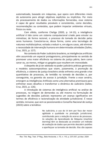 Rev. Trib. Reg. Trab. 3ª Reg., Belo Horizonte, v. 70, n. 110, p. 237-257, jul./dez. 2024241automatizado, baseado em máquinas, que opera com diferentes níveis de autonomia para atingir objetivos explícitos ou implícitos. Por meio do processamento de dados ou informações fornecidas, esse sistema é capaz de gerar resultados prováveis e consistentes, como decisões, recomendações ou conteúdos, que podem impactar ambientes virtuais, físicos ou reais.Com efeito, conforme Cheliga (2020, p. 14-15), a inteligência artificial é tida como um sistema computacional criado para emular ou mimetizar, de forma racional, o processo de tomada de decisão pelos seres humanos. Caracteriza-se, dessa forma, como uma tecnologia de natureza multidisciplinar, voltada a reduzir e, em alguns casos, até eliminar a necessidade de intervenção humana em determinadas atividades (Salles; Cruz, 2021, p. 127).No contexto do Poder Judiciário brasileiro, as inteligências artificiais vêm assumindo um especial protagonismo, principalmente no sentido de promover uma maior eficiência no sistema de justiça pátrio, bem como sanar ou, ao menos, mitigar os gargalos que resultem em morosidade.A despeito de já ser adotada no poder judiciário práticas gerenciais e modelos autocompositivos que visem, justamente, à promoção da eficiência, o sistema de justiça brasileiro ainda enfrenta uma grande crise quantitativa de processos, de lentidão na tomada de decisões e, por conseguinte, na garantia do acesso à jurisdição. Frente a esse cenário, emergem as Inteligências Artificiais como uma alternativa promissora para enfrentar esses desafios e transformar a dinâmica do Judiciário (Salles; Cruz, 2021, p. 126).A introdução de sistemas de inteligência artificial na análise de processos, na triagem de demandas ou até mesmo na formulação de sugestões de decisões judiciais representa um avanço significativo em termos de eficiência e racionalização da atividade jurisdicional. É nesse sentido, inclusive, que vem se posicionando o Conselho Nacional de Justiça (2023) sobre a temática:No Judiciário, o uso da IA tem por foco dar maior agilidade e qualidade na prestação jurisdicional, contribuindo para a redução do acervo de processos. As soluções de Aprendizado de Máquina (machine learning) têm se destacado ao envolver um método de avaliação de dados que permite descobrir padrões e aperfeiçoar as tomadas de decisão. Elas são capazes