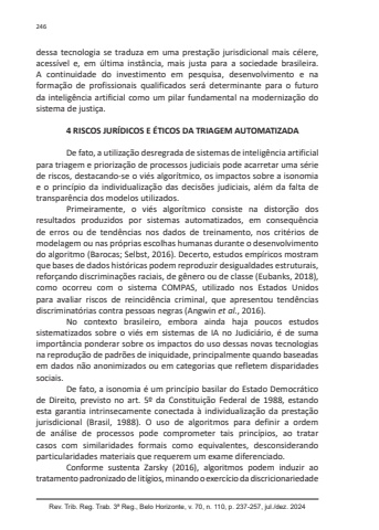 Rev. Trib. Reg. Trab. 3ª Reg., Belo Horizonte, v. 70, n. 110, p. 237-257, jul./dez. 2024246dessa tecnologia se traduza em uma prestação jurisdicional mais célere, acessível e, em última instância, mais justa para a sociedade brasileira. A continuidade do investimento em pesquisa, desenvolvimento e na formação de profissionais qualificados será determinante para o futuro da inteligência artificial como um pilar fundamental na modernização do sistema de justiça.4 RISCOS JURÍDICOS E ÉTICOS DA TRIAGEM AUTOMATIZADADe fato, a utilização desregrada de sistemas de inteligência artificial para triagem e priorização de processos judiciais pode acarretar uma série de riscos, destacando-se o viés algorítmico, os impactos sobre a isonomia e o princípio da individualização das decisões judiciais, além da falta de transparência dos modelos utilizados.Primeiramente, o viés algorítmico consiste na distorção dos resultados produzidos por sistemas automatizados, em consequência de erros ou de tendências nos dados de treinamento, nos critérios de modelagem ou nas próprias escolhas humanas durante o desenvolvimento do algoritmo (Barocas; Selbst, 2016). Decerto, estudos empíricos mostram que bases de dados históricas podem reproduzir desigualdades estruturais, reforçando discriminações raciais, de gênero ou de classe (Eubanks, 2018), como ocorreu com o sistema COMPAS, utilizado nos Estados Unidos para avaliar riscos de reincidência criminal, que apresentou tendências discriminatórias contra pessoas negras (Angwin et al., 2016).No contexto brasileiro, embora ainda haja poucos estudos sistematizados sobre o viés em sistemas de IA no Judiciário, é de suma importância ponderar sobre os impactos do uso dessas novas tecnologias na reprodução de padrões de iniquidade, principalmente quando baseadas em dados não anonimizados ou em categorias que refletem disparidades sociais.De fato, a isonomia é um princípio basilar do Estado Democrático de Direito, previsto no art. 5º da Constituição Federal de 1988, estando esta garantia intrinsecamente conectada à individualização da prestação jurisdicional (Brasil, 1988). O uso de algoritmos para definir a ordem de análise de processos pode comprometer tais princípios, ao tratar casos com similaridades formais como equivalentes, desconsiderando particularidades materiais que requerem um exame diferenciado.Conforme sustenta Zarsky (2016), algoritmos podem induzir ao tratamento padronizado de litígios, minando o exercício da discricionariedade