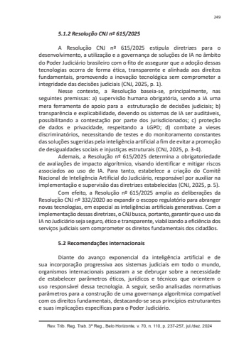 Rev. Trib. Reg. Trab. 3ª Reg., Belo Horizonte, v. 70, n. 110, p. 237-257, jul./dez. 20242495.1.2 Resolução CNJ nº 615/2025A Resolução CNJ nº 615/2025 estipula diretrizes para o desenvolvimento, a utilização e a governança de soluções de IA no âmbito do Poder Judiciário brasileiro com o fito de assegurar que a adoção dessas tecnologias ocorra de forma ética, transparente e alinhada aos direitos fundamentais, promovendo a inovação tecnológica sem comprometer a integridade das decisões judiciais (CNJ, 2025, p. 1).Nesse contexto, a Resolução baseia-se, principalmente, nas seguintes premissas: a) supervisão humana obrigatória, sendo a IA uma mera ferramenta de apoio para a estruturação de decisões judiciais; b) transparência e explicabilidade, devendo os sistemas de IA ser auditáveis, possibilitando a contestação por parte dos jurisdicionados; c) proteção de dados e privacidade, respeitando a LGPD; d) combate a vieses discriminatórios, necessitando de testes e do monitoramento constantes das soluções sugeridas pela inteligência artificial a fim de evitar a promoção de desigualdades sociais e injustiças estruturais (CNJ, 2025, p. 3-4).Ademais, a Resolução nº 615/2025 determina a obrigatoriedade de avaliações de impacto algorítmico, visando identificar e mitigar riscos associados ao uso de IA. Para tanto, estabelece a criação do Comitê Nacional de Inteligência Artificial do Judiciário, responsável por auxiliar na implementação e supervisão das diretrizes estabelecidas (CNJ, 2025, p. 5).Com efeito, a Resolução nº 615/2025 amplia as deliberações da Resolução CNJ nº 332/2020 ao expandir o escopo regulatório para abranger novas tecnologias, em especial as inteligências artificiais generativas. Com a implementação dessas diretrizes, o CNJ busca, portanto, garantir que o uso da IA no Judiciário seja seguro, ético e transparente, viabilizando a eficiência dos serviços judiciais sem comprometer os direitos fundamentais dos cidadãos.5.2 Recomendações internacionaisDiante do avanço exponencial da inteligência artificial e de sua incorporação progressiva aos sistemas judiciais em todo o mundo, organismos internacionais passaram a se debruçar sobre a necessidade de estabelecer parâmetros éticos, jurídicos e técnicos que orientem o uso responsável dessa tecnologia. A seguir, serão analisadas normativas parâmetros para a construção de uma governança algorítmica compatível com os direitos fundamentais, destacando-se seus princípios estruturantes e suas implicações específicas para o Poder Judiciário.