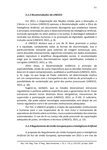 Rev. Trib. Reg. Trab. 3ª Reg., Belo Horizonte, v. 70, n. 110, p. 237-257, jul./dez. 20242515.2.2 Recomendações da UNESCOEm 2021, a Organização das Nações Unidas para a Educação, a Ciência e a Cultura (UNESCO) aprovou a Recomendação sobre a Ética da Inteligência Artificial, um documento abrangente que estabelece valores e princípios orientadores para o desenvolvimento da Inteligência Artificial, incluindo aplicações no setor público e na Justiça. A abordagem adotada é centrada nos direitos humanos e na promoção da dignidade, igualdade e inclusão social (UNESCO, 2021, p. 8).A UNESCO destaca que o uso da IA deve promover a justiça e a equidade, combatendo todas as formas de discriminação. Isso é particularmente relevante para sistemas de triagem processual, pois, como discutido anteriormente, algoritmos treinados em dados enviesados podem reproduzir e amplificar desigualdades sociais. A recomendação exige que os impactos discriminatórios sejam identificados, evitados e corrigidos (UNESCO, 2021, p. 10).Além disso, a Recomendação evidencia o princípio da explicabilidade, sendo de suma importância que as decisões tomadas com base em IA sejam compreensíveis, auditáveis e justificáveis (UNESCO, 2021, p. 9). Logo, no que tange ao Poder Judiciário, tal determinação implica em um compromisso com a transparência dos critérios de priorização e a possibilidade de contestação por parte das partes processuais (UNESCO, 2021, p. 10).Sugere-se, também, que os Estados desenvolvam estruturas regulatórias e políticas públicas específicas para a governança da IA. Essas estruturas devem incluir diretrizes éticas obrigatórias, mecanismos de supervisão e participação social (UNESCO, 2021, p. 9-10). O Judiciário, portanto, não pode adotar tecnologias automatizadas sem dispor de um marco regulatório claro e de controles institucionais adequados.Por fim, a UNESCO propõe a criação de capacidades institucionais e humanas para o uso responsável da IA. Isso inclui o treinamento de operadores do Direito sobre os limites, riscos e potencialidades dos sistemas automatizados. O uso da IA na Justiça não pode prescindir da capacitação adequada de juízes, servidores e técnicos (UNESCO, 2021, p. 13).5.2.3 Regulamento da União Europeia para a Inteligência ArtificialA proposta do Regulamento da União Europeia para a Inteligência Artificial (AI Act da União Europeia), apresentado em 2021 e em vias de