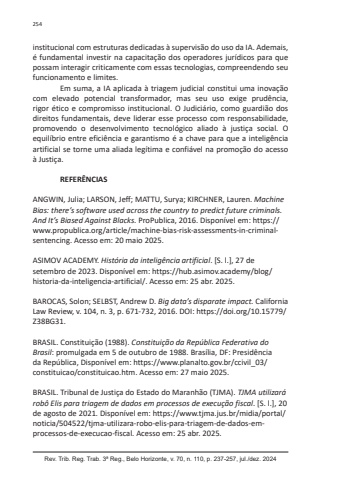 Rev. Trib. Reg. Trab. 3ª Reg., Belo Horizonte, v. 70, n. 110, p. 237-257, jul./dez. 2024254institucional com estruturas dedicadas à supervisão do uso da IA. Ademais, é fundamental investir na capacitação dos operadores jurídicos para que possam interagir criticamente com essas tecnologias, compreendendo seu funcionamento e limites.Em suma, a IA aplicada à triagem judicial constitui uma inovação com elevado potencial transformador, mas seu uso exige prudência, rigor ético e compromisso institucional. O Judiciário, como guardião dos direitos fundamentais, deve liderar esse processo com responsabilidade, promovendo o desenvolvimento tecnológico aliado à justiça social. O equilíbrio entre eficiência e garantismo é a chave para que a inteligência artificial se torne uma aliada legítima e confiável na promoção do acesso à Justiça.REFERÊNCIASANGWIN, Julia; LARSON, Jeff; MATTU, Surya; KIRCHNER, Lauren. Machine Bias: there’s software used across the country to predict future criminals. And It’s Biased Against Blacks. ProPublica, 2016. Disponível em: https://www.propublica.org/article/machine-bias-risk-assessments-in-criminalsentencing. Acesso em: 20 maio 2025.ASIMOV ACADEMY. História da inteligência artificial. [S. l.], 27 de setembro de 2023. Disponível em: https://hub.asimov.academy/blog/historia-da-inteligencia-artificial/. Acesso em: 25 abr. 2025.BAROCAS, Solon; SELBST, Andrew D. Big data’s disparate impact. California Law Review, v. 104, n. 3, p. 671-732, 2016. DOI: https://doi.org/10.15779/Z38BG31.BRASIL. Constituição (1988). Constituição da República Federativa do Brasil: promulgada em 5 de outubro de 1988. Brasília, DF: Presidência da República, Disponível em: https://www.planalto.gov.br/ccivil_03/constituicao/constituicao.htm. Acesso em: 27 maio 2025.BRASIL. Tribunal de Justiça do Estado do Maranhão (TJMA). TJMA utilizará robô Elis para triagem de dados em processos de execução fiscal. [S. l.], 20 de agosto de 2021. Disponível em: https://www.tjma.jus.br/midia/portal/noticia/504522/tjma-utilizara-robo-elis-para-triagem-de-dados-emprocessos-de-execucao-fiscal. Acesso em: 25 abr. 2025.