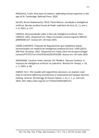 Rev. Trib. Reg. Trab. 3ª Reg., Belo Horizonte, v. 70, n. 110, p. 237-257, jul./dez. 2024257PASQUALE, Frank. New laws of robotics: defending human expertise in the age of AI. Cambridge: Belknap Press, 2020.SALLES, Bruno Makowiecky; CRUZ, Paulo Márcio. Jurisdição e inteligência artificial. Revista Jurídica Escola do Poder Judiciário do Acre, [S. l.], ano 1, n. 0, 2021, p. 127.UNESCO. Recomendação sobre a ética da inteligência artificial. Paris: UNESCO, 2021. Disponível em: https://unesdoc.unesco.org/ark:/48223/pf0000381137. Acesso em: 20 maio 2025.UNIÃO EUROPEIA. Proposta de Regulamento que estabelece regras harmonizadas em matéria de inteligência artificial (AI Act). COM (2021) 206 final. Bruxelas, 2021. Disponível em: https://eur-lex.europa.eu/legalcontent/PT/TXT/?uri=CELEX%3A52021PC0206. Acesso em: 20 maio 2025.WATANABE, Carolina Yukari Veludo; DE FRANÇA, Taynara Cardoso. O impacto da inteligência artificial no judiciário. Revista Em Tempo, v. 24, n. 1, 2025, p. 66.ZARSKY, Tal Z. The trouble with algorithmic decisions: an analytic road map to examine efficiency and fairness in automated and opaque decision making. Science, Technology, & Human Values, v. 41, n. 1, p. 118-132, 2016. DOI: https://doi.org/10.1177/0162243915605575.
