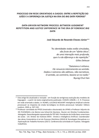 Rev. Trib. Reg. Trab. 3ª Reg., Belo Horizonte, v. 70, n. 110, p. 259-303, jul./dez. 2024259PROCESSO EM REDE ORIENTADO A DADOS: ENTRE A REPETIÇÃO DO JUÍZO E A DIFERENÇA DA JUSTIÇA NA ERA DO BIG DATA FORENSE*DATAͳDRIVEN NETWORK PROCESS: BETWEEN JUDGMENT REPETITION AND JUSTICE DIFFERENCE IN THE ERA OF FORENSIC BIG DATAJosé Eduardo de Resende Chaves Júnior**“As identidades todas estão simuladas,são fruto de um “efeito ótico”,de uma interação mais profunda,que é a da diferença e da repetição.”Gilles Deleuze“Dataísmo é niilismo.Ele renuncia inteiramente ao sentido.Dados e números são aditivos, não narrativos.O sentido, ao contrário, baseia-se na razão.”Byung-Chul Han* Este artigo foi atualizado e revisado - em função da vertiginosa evolução dos modelos de linguagem - a partir do texto originalmente publicado: CHAVES JÚNIOR, J. E. R. Processo em rede orientado a dados. In: NUNES, LUCON & WOLKART Inteligência Artificial e direito processual: os impactos da virada tecnológica no direito processual. Salvador: Editora Jusdivm, 2020, p. 507-532.** Professor convidado do PPGD (mestrado e doutorado) da UFMG e Professor Adjunto do IEC-PUCMINAS e da Skema Law School for Business. Doutor em Direitos Fundamentais. Advogado. Desembargador aposentado do TRT-MG. Presidente da União Ibero-americana de Juízes - UIJ. Diretor do Instituto IDEIA - Direito e Inteligência Artificial. Coordenador das obras Comentários à Lei do Processo Eletrônico (2010) & Tecnologias Disruptivas e a Exploração do Trabalho Humano (2017). Conferencista convidado em 9 países. Advogado trabalhista.