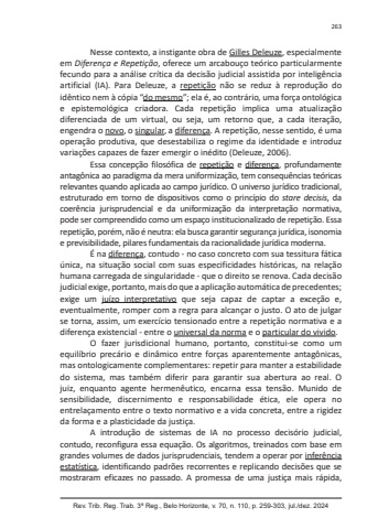 Rev. Trib. Reg. Trab. 3ª Reg., Belo Horizonte, v. 70, n. 110, p. 259-303, jul./dez. 2024263Nesse contexto, a instigante obra de Gilles Deleuze, especialmente em Diferença e Repetição, oferece um arcabouço teórico particularmente fecundo para a análise crítica da decisão judicial assistida por inteligência artificial (IA). Para Deleuze, a repetição não se reduz à reprodução do idêntico nem à cópia “do mesmo”; ela é, ao contrário, uma força ontológica e epistemológica criadora. Cada repetição implica uma atualização diferenciada de um virtual, ou seja, um retorno que, a cada iteração, engendra o novo, o singular, a diferença. A repetição, nesse sentido, é uma operação produtiva, que desestabiliza o regime da identidade e introduz variações capazes de fazer emergir o inédito (Deleuze, 2006).Essa concepção filosófica de repetição e diferença, profundamente antagônica ao paradigma da mera uniformização, tem consequências teóricas relevantes quando aplicada ao campo jurídico. O universo jurídico tradicional, estruturado em torno de dispositivos como o princípio do stare decisis, da coerência jurisprudencial e da uniformização da interpretação normativa, pode ser compreendido como um espaço institucionalizado de repetição. Essa repetição, porém, não é neutra: ela busca garantir segurança jurídica, isonomia e previsibilidade, pilares fundamentais da racionalidade jurídica moderna.É na diferença, contudo - no caso concreto com sua tessitura fática única, na situação social com suas especificidades históricas, na relação humana carregada de singularidade - que o direito se renova. Cada decisão judicial exige, portanto, mais do que a aplicação automática de precedentes; exige um juízo interpretativo que seja capaz de captar a exceção e, eventualmente, romper com a regra para alcançar o justo. O ato de julgar se torna, assim, um exercício tensionado entre a repetição normativa e a diferença existencial - entre o universal da norma e o particular do vivido.O fazer jurisdicional humano, portanto, constitui-se como um equilíbrio precário e dinâmico entre forças aparentemente antagônicas, mas ontologicamente complementares: repetir para manter a estabilidade do sistema, mas também diferir para garantir sua abertura ao real. O juiz, enquanto agente hermenêutico, encarna essa tensão. Munido de sensibilidade, discernimento e responsabilidade ética, ele opera no entrelaçamento entre o texto normativo e a vida concreta, entre a rigidez da forma e a plasticidade da justiça.A introdução de sistemas de IA no processo decisório judicial, contudo, reconfigura essa equação. Os algoritmos, treinados com base em grandes volumes de dados jurisprudenciais, tendem a operar por inferência estatística, identificando padrões recorrentes e replicando decisões que se mostraram eficazes no passado. A promessa de uma justiça mais rápida,