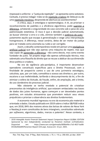 Rev. Trib. Reg. Trab. 3ª Reg., Belo Horizonte, v. 70, n. 110, p. 259-303, jul./dez. 2024264impessoal e uniforme - a “justiça da repetição” - se apresenta como sedutora. Contudo, é preciso indagar: trata-se da repetição criadora de Deleuze ou de uma repetição mecânica, desprovida de abertura ao acontecimento?A crítica, aqui, é ontológica e epistemológica. A IA, ao priorizar o reconhecimento de padrões e a eficiência algorítmica, pode suprimir a diferença, achatando a singularidade do caso concreto sob o peso de uma padronização estatística. O risco é que a decisão judicial automatizada, ao buscar eliminar o erro e o viés, elimine também a potência do justo - justamente aquilo que escapa à generalização e exige uma interpretação transgressora. A diferença, nesse cenário, deixa de ser motor da justiça para ser tratada como anomalia ou ruído a ser corrigido.Assim, o desafio contemporâneo reside em pensar uma inteligência artificial judicial que não seja apenas uma máquina de repetir, mas que seja capaz de apreender a diferença - não como desvio, mas como evento fundador do justo. Tal projeto exige não apenas sofisticação técnica, mas sobretudo uma filosofia do direito que se recuse a abdicar da sua dimensão ético-política e criadora.Na era da vigilância pós-panóptica, é importante desenvolver operadores conceituais específicos para o Direito Processual, com a finalidade de prepará-lo contra o uso de uma jurimetria estratégica, calculista, que, por um lado, comoditiza o acesso aos direitos e, por outro, escalona a sua inefetividade, tarifando o descumprimento da lei, a fim de otimizar a esfera da ilicitude, da fraude, enfim, de ampliação, até o limite, do uso clandestino do processo judicial.Não obstante se tenha revelado o potencial de cristalizar preconceitos da inteligência artificial, que estavam embaciados nas bases de dados dos juízes humanos, agora começam a ser desvelados pontos positivos, em estudos alvissareiros que prometem reduzir seus vieses prejudiciais e priorizar a observância aos direitos fundamentais.A economia mundial ingressou na era da economia pós-material e orientada a dados. Estudo publicado em 2019 sobre o índice S&P500 indica que, em 2018, 84% dos maiores ativos das bolsas de valores de Nova York e Nasdaq já eram constituídos de bens intangíveis, constituídos sobretudo por softwares, algoritmos, dados, marcas e patentes2. Nesse contexto, a 2 2019 Intangible Assets Financial Statement Impact Comparison Report GLOBAL EDITION Sponsored by Aon Independently conducted by Ponemon Institute LLCPublication. Disponível em: https://www.aon.com/getmedia/60fbb49a-c7a5-4027-ba98-0553b29dc89f/Ponemon-Report-V24.aspx. Acesso em: 15 jun. 2025.