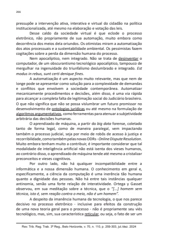 Rev. Trib. Reg. Trab. 3ª Reg., Belo Horizonte, v. 70, n. 110, p. 259-303, jul./dez. 2024266pressupõe a intervenção ativa, interativa e virtual do cidadão na política institucionalizada, até mesmo na elaboração e votação das leis.Desse caldo da sociedade virtual é que eclode o processo eletrônico, não propriamente de sua automação, muito embora como decorrência dos meios dela oriundos. Os otimistas miram a automatização dos atos processuais e a sustentabilidade ambiental. Os pessimistas fazem cogitações sobre a perda da dimensão humana do processo.Nem apocalíptico, nem integrado. Não se trata de desinventar o computador, de um obscurantismo tecnológico apocalíptico, tampouco de mergulhar na ingenuidade do triunfalismo deslumbrado e integrado. Est modus in rebus, sunt certi denique fines.A automatização é um aspecto muito relevante, mas que nem de longe pode se apresentar como solução para a complexidade de demandas e conflitos que envolvem a sociedade contemporânea. Automatizar mecanicamente procedimentos e decisões, além disso, é uma via rápida para alcançar a completa falta de legitimação social do Judiciário brasileiro. O que não significa que não se possa vislumbrar um futuro promissor no desenvolvimento de ontologias jurídicas ou até mesmo na formulação de algoritmos argumentativos, como ferramentas para atenuar a subjetividade arbitrária das decisões humanas.O aprendizado de máquina, a partir do big data forense, coletado tanto de forma legal, como de maneira paralegal, vem impactando também o processo judicial, seja por meio de robôs de acesso à justiça e recorribilidade, como também pelas novas ODRs - OnlineDisputeResolution. Muito embora tenham muito a contribuir, é importante considerar que tal modalidade de inteligência artificial não está isenta dos vieses humanos, ao contrário disso, o aprendizado de máquina tende até mesmo a cristalizar preconceitos e vieses cognitivos.Por outro lado, não há qualquer incompatibilidade entre a informática e a nossa dimensão humana. O conhecimento em geral e, especificamente, a ciência da computação é uma inerência tão humana quanto a dignidade das pessoas. Não há entre tais instâncias qualquer antinomia, senão uma forte relação de interatividade. Ortega y Gasset observou, em sua meditação sobre a técnica, que o “[...] homem sem técnica, isto é, sem reação contra o meio, não é um homem”.A despeito da imanência humana da tecnologia, o que nos parece decisivo no processo eletrônico - inclusive para efeitos da construção de uma nova teoria geral para o processo - não é propriamente seu viés tecnológico, mas, sim, sua característica reticular, ou seja, o fato de ser um