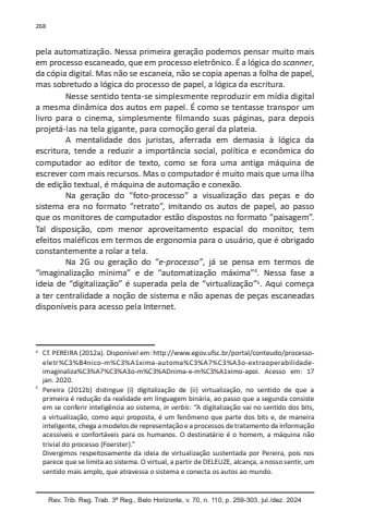 Rev. Trib. Reg. Trab. 3ª Reg., Belo Horizonte, v. 70, n. 110, p. 259-303, jul./dez. 2024268pela automatização. Nessa primeira geração podemos pensar muito mais em processo escaneado, que em processo eletrônico. É a lógica do scanner, da cópia digital. Mas não se escaneia, não se copia apenas a folha de papel, mas sobretudo a lógica do processo de papel, a lógica da escritura.Nesse sentido tenta-se simplesmente reproduzir em mídia digital a mesma dinâmica dos autos em papel. É como se tentasse transpor um livro para o cinema, simplesmente filmando suas páginas, para depois projetá-las na tela gigante, para comoção geral da plateia.A mentalidade dos juristas, aferrada em demasia à lógica da escritura, tende a reduzir a importância social, política e econômica do computador ao editor de texto, como se fora uma antiga máquina de escrever com mais recursos. Mas o computador é muito mais que uma ilha de edição textual, é máquina de automação e conexão.Na geração do “foto-processo” a visualização das peças e do sistema era no formato “retrato”, imitando os autos de papel, ao passo que os monitores de computador estão dispostos no formato “paisagem”. Tal disposição, com menor aproveitamento espacial do monitor, tem efeitos maléficos em termos de ergonomia para o usuário, que é obrigado constantemente a rolar a tela.Na 2G ou geração do “e-processo”, já se pensa em termos de “imaginalização mínima” e de “automatização máxima”4. Nessa fase a ideia de “digitalização” é superada pela de “virtualização”5. Aqui começa a ter centralidade a noção de sistema e não apenas de peças escaneadas disponíveis para acesso pela Internet.4 Cf. PEREIRA (2012a). Disponível em: http://www.egov.ufsc.br/portal/conteudo/processoeletr%C3%B4nico-m%C3%A1xima-automa%C3%A7%C3%A3o-extraoperabilidadeimaginaliza%C3%A7%C3%A3o-m%C3%ADnima-e-m%C3%A1ximo-apoi. Acesso em: 17 jan. 2020. 5 Pereira (2012b) distingue (i) digitalização de (ii) virtualização, no sentido de que a primeira é redução da realidade em linguagem binária, ao passo que a segunda consiste em se conferir inteligência ao sistema, in verbis: “A digitalização vai no sentido dos bits, a virtualização, como aqui proposta, é um fenômeno que parte dos bits e, de maneira inteligente, chega a modelos de representação e a processos de tratamento da informação acessíveis e confortáveis para os humanos. O destinatário é o homem, a máquina não trivial do processo (Foerster).” Divergimos respeitosamente da ideia de virtualização sustentada por Pereira, pois nos parece que se limita ao sistema. O virtual, a partir de DELEUZE, alcança, a nosso sentir, um sentido mais amplo, que atravessa o sistema e conecta os autos ao mundo.