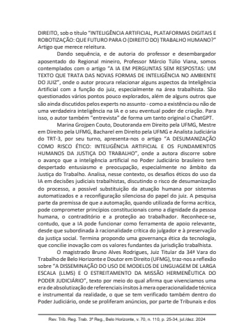 Rev. Trib. Reg. Trab. 3ª Reg., Belo Horizonte, v. 70, n. 110, p. 25-34, jul./dez. 2024DIREITO, sob o título “INTELIGÊNCIA ARTIFICIAL, PLATAFORMAS DIGITAIS E ROBOTIZAÇÃO: QUE FUTURO PARA O (DIREITO DO) TRABALHO HUMANO?” Artigo que merece releitura.Dando sequência, e de autoria do professor e desembargador aposentado do Regional mineiro, Professor Márcio Túlio Viana, somos contemplados com o artigo “A IA EM PERGUNTAS SEM RESPOSTAS: UM TEXTO QUE TRATA DAS NOVAS FORMAS DE INTELIGÊNCIA NO AMBIENTE DO JUIZ”, onde o autor procura relacionar alguns aspectos da Inteligência Artificial com a função do juiz, especialmente na área trabalhista. São questionados vários pontos pouco explorados, além de alguns outros que são ainda discutidos pelos experts no assunto - como a existência ou não de uma verdadeira inteligência na IA e o seu eventual poder de criação. Para isso, o autor também “entrevista” de forma um tanto original o ChatGPT.Marina Grojpen Couto, Doutoranda em Direito pela UFMG, Mestre em Direito pela UFMG, Bacharel em Direito pela UFMG e Analista Judiciária do TRT-3, por seu turno, apresenta-nos o artigo “A DESUMANIZAÇÃO COMO RISCO ÉTICO: INTELIGÊNCIA ARTIFICIAL E OS FUNDAMENTOS HUMANOS DA JUSTIÇA DO TRABALHO”, onde a autora discorre sobre o avanço que a inteligência artificial no Poder Judiciário brasileiro tem despertado entusiasmo e preocupação, especialmente no âmbito da Justiça do Trabalho. Analisa, nesse contexto, os desafios éticos do uso da IA em decisões judiciais trabalhistas, discutindo o risco de desumanização do processo, a possível substituição da atuação humana por sistemas automatizados e a reconfiguração silenciosa do papel do juiz. A pesquisa parte da premissa de que a automação, quando utilizada de forma acrítica, pode comprometer princípios constitucionais como a dignidade da pessoa humana, o contraditório e a proteção ao trabalhador. Reconhece-se, contudo, que a IA pode funcionar como ferramenta de apoio relevante, desde que subordinada à racionalidade crítica do julgador e à preservação da justiça social. Termina propondo uma governança ética da tecnologia, que concilie inovação com os valores fundantes da jurisdição trabalhista.O magistrado Bruno Alves Rodrigues, Juiz Titular da 34ª Vara do Trabalho de Belo Horizonte e Doutor em Direito (UFMG), traz-nos a reflexão sobre “A DISSEMINAÇÃO DO USO DE MODELOS DE LINGUAGEM DE LARGA ESCALA (LLMS) E O ESTREITAMENTO DA MISSÃO HERMENÊUTICA DO PODER JUDICIÁRIO”, texto por meio do qual afirma que vivenciamos uma era de absolutização de referenciais ínsitos à mera operacionalidade técnica e instrumental da realidade, o que se tem verificado também dentro do Poder Judiciário, onde se proliferam anúncios, por parte de Tribunais e dos