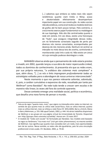 Rev. Trib. Reg. Trab. 3ª Reg., Belo Horizonte, v. 70, n. 110, p. 259-303, jul./dez. 2024271[...] sabemos que embora as redes reais não sejam randômicas quanto viam Erdós e Rényi, acaso e aleatoriedade efetivamente desempenham importante papel em sua construção. As redes sociais não são estáticas, como eram todos os modelos teóricos de grafos até há bem pouco tempo. Pelo contrário, o crescimento exerce papel fundamental na modelagem de sua topologia. Não são tão centralizadas quanto a rede em estrela. Em vez disso, existe uma hierarquia de “hubs”, que assegura integridade dessas redes, um nó fortemente conectado seguido de perto por diversos nós menos conectados, acompanhados por dezenas de nós menores ainda. Nenhum nó central se interpõe no meio dessa teia de aranha, controlando e monitorando cada link e cada nó. Não existe um único nó cuja remoção pudesse desintegrar a rede.BARABÁSI observa ainda que o pensamento de rede estaria prestes a invadir, em 2002, quando lançou a sua obra de maior repercussão Linked, todos os domínios do conhecimento. Já pressentia ele que as redes eram, por sua própria natureza, “a urdidura dos sistemas mais complexos” e que, além disso, “[...] os nós e links impregnam profundamente todas as estratégias voltadas para a abordagem de nosso universo interconectado”.Neste momento o que nos parece relevante salientar, sobretudo, é, pois, o caráter cumulativo e expansivo da rede, ressaltado por tanto por Wellman8 como Barabási9. Na rede tudo tende a crescer sem escalas e de maneira não linear, às vezes até fora do controle aparente.Desse contexto emerge uma realidade social, política e econômica, que desafia uma nova forma de pensar o mundo.8 Fala-se da regra “quanto mais, mais”, que vigora na interação entre redes na internet; no sentido de que quanto mais se utiliza rede social-física, mais se utiliza internet; quanto mais se utiliza internet, mais se reforça a rede física Cfr. WELLMAN, Barry y GULIA, Mena in Barry Welmman, p. 331-366 apud Castels, 2002, p. 444. Há vários trabalhos disponíveis de Wellman e seu grupo em sua página virtual da Universidade de Toronto. Disponível em: http://groups.chass.utoronto.ca/netlab/. Acesso em: 25 maio 2017. 9 O modelo de “redes sem escala” foi formulado por Barabási. Seu modelo está baseado na regra ou fenômeno “rico-mais-rico” (rich get richer phenomenon), no mesmo sentido de Wellman. Isso significa que quanto mais conexões tem um nodo, mais oportunidades tem de ter outros. Nesse sentido, as redes não são igualitárias, pois há uma vinculação preferencial à mais usada. Cfr. Barabási, 2002, p. 79-82.