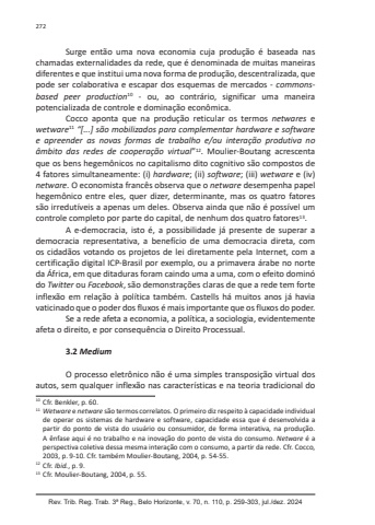 Rev. Trib. Reg. Trab. 3ª Reg., Belo Horizonte, v. 70, n. 110, p. 259-303, jul./dez. 2024272Surge então uma nova economia cuja produção é baseada nas chamadas externalidades da rede, que é denominada de muitas maneiras diferentes e que institui uma nova forma de produção, descentralizada, que pode ser colaborativa e escapar dos esquemas de mercados - commonsbased peer production10 - ou, ao contrário, significar uma maneira potencializada de controle e dominação econômica.Cocco aponta que na produção reticular os termos netwares e wetware11 “[...] são mobilizados para complementar hardware e software e apreender as novas formas de trabalho e/ou interação produtiva no âmbito das redes de cooperação virtual”12. Moulier-Boutang acrescenta que os bens hegemônicos no capitalismo dito cognitivo são compostos de 4 fatores simultaneamente: (i) hardware; (ii) software; (iii) wetware e (iv) netware. O economista francês observa que o netware desempenha papel hegemônico entre eles, quer dizer, determinante, mas os quatro fatores são irredutíveis a apenas um deles. Observa ainda que não é possível um controle completo por parte do capital, de nenhum dos quatro fatores13.A e-democracia, isto é, a possibilidade já presente de superar a democracia representativa, a benefício de uma democracia direta, com os cidadãos votando os projetos de lei diretamente pela Internet, com a certificação digital ICP-Brasil por exemplo, ou a primavera árabe no norte da África, em que ditaduras foram caindo uma a uma, com o efeito dominó do Twitter ou Facebook, são demonstrações claras de que a rede tem forte inflexão em relação à política também. Castells há muitos anos já havia vaticinado que o poder dos fluxos é mais importante que os fluxos do poder.Se a rede afeta a economia, a política, a sociologia, evidentemente afeta o direito, e por consequência o Direito Processual.3.2 MediumO processo eletrônico não é uma simples transposição virtual dos autos, sem qualquer inflexão nas características e na teoria tradicional do 10 Cfr. Benkler, p. 60.11 Wetware e netware são termos correlatos. O primeiro diz respeito à capacidade individual de operar os sistemas de hardware e software, capacidade essa que é desenvolvida a partir do ponto de vista do usuário ou consumidor, de forma interativa, na produção. A ênfase aqui é no trabalho e na inovação do ponto de vista do consumo. Netware é a perspectiva coletiva dessa mesma interação com o consumo, a partir da rede. Cfr. Cocco, 2003, p. 9-10. Cfr. também Moulier-Boutang, 2004, p. 54-55. 12 Cfr. Ibid., p. 9. 13 Cfr. Moulier-Boutang, 2004, p. 55.