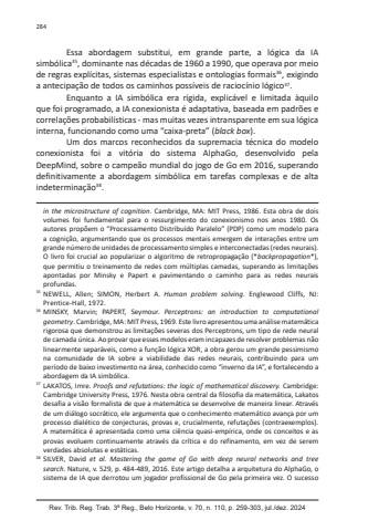 Rev. Trib. Reg. Trab. 3ª Reg., Belo Horizonte, v. 70, n. 110, p. 259-303, jul./dez. 2024284Essa abordagem substitui, em grande parte, a lógica da IA simbólica35, dominante nas décadas de 1960 a 1990, que operava por meio de regras explícitas, sistemas especialistas e ontologias formais36, exigindo a antecipação de todos os caminhos possíveis de raciocínio lógico37.Enquanto a IA simbólica era rígida, explicável e limitada àquilo que foi programado, a IA conexionista é adaptativa, baseada em padrões e correlações probabilísticas - mas muitas vezes intransparente em sua lógica interna, funcionando como uma “caixa-preta” (black box).Um dos marcos reconhecidos da supremacia técnica do modelo conexionista foi a vitória do sistema AlphaGo, desenvolvido pela DeepMind, sobre o campeão mundial do jogo de Go em 2016, superando definitivamente a abordagem simbólica em tarefas complexas e de alta indeterminação38.in the microstructure of cognition. Cambridge, MA: MIT Press, 1986. Esta obra de dois volumes foi fundamental para o ressurgimento do conexionismo nos anos 1980. Os autores propõem o “Processamento Distribuído Paralelo” (PDP) como um modelo para a cognição, argumentando que os processos mentais emergem de interações entre um grande número de unidades de processamento simples e interconectadas (redes neurais). O livro foi crucial ao popularizar o algoritmo de retropropagação (*backpropagation*), que permitiu o treinamento de redes com múltiplas camadas, superando as limitações apontadas por Minsky e Papert e pavimentando o caminho para as redes neurais profundas. 35 NEWELL, Allen; SIMON, Herbert A. Human problem solving. Englewood Cliffs, NJ: Prentice-Hall, 1972. 36 MINSKY, Marvin; PAPERT, Seymour. Perceptrons: an introduction to computational geometry. Cambridge, MA: MIT Press, 1969. Este livro apresentou uma análise matemática rigorosa que demonstrou as limitações severas dos Perceptrons, um tipo de rede neural de camada única. Ao provar que esses modelos eram incapazes de resolver problemas não linearmente separáveis, como a função lógica XOR, a obra gerou um grande pessimismo na comunidade de IA sobre a viabilidade das redes neurais, contribuindo para um período de baixo investimento na área, conhecido como “inverno da IA”, e fortalecendo a abordagem da IA simbólica. 37 LAKATOS, Imre. Proofs and refutations: the logic of mathematical discovery. Cambridge: Cambridge University Press, 1976. Nesta obra central da filosofia da matemática, Lakatos desafia a visão formalista de que a matemática se desenvolve de maneira linear. Através de um diálogo socrático, ele argumenta que o conhecimento matemático avança por um processo dialético de conjecturas, provas e, crucialmente, refutações (contraexemplos). A matemática é apresentada como uma ciência quasi-empírica, onde os conceitos e as provas evoluem continuamente através da crítica e do refinamento, em vez de serem verdades absolutas e estáticas. 38 SILVER, David et al. Mastering the game of Go with deep neural networks and tree search. Nature, v. 529, p. 484-489, 2016. Este artigo detalha a arquitetura do AlphaGo, o sistema de IA que derrotou um jogador profissional de Go pela primeira vez. O sucesso