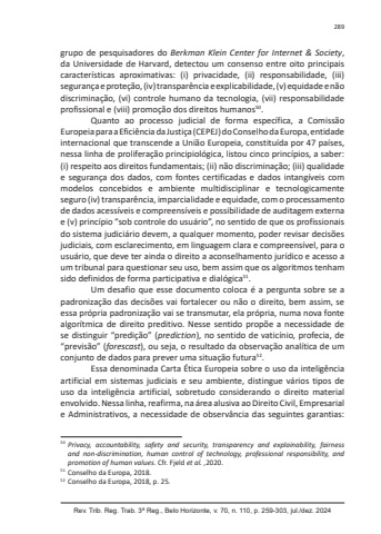 Rev. Trib. Reg. Trab. 3ª Reg., Belo Horizonte, v. 70, n. 110, p. 259-303, jul./dez. 2024289grupo de pesquisadores do Berkman Klein Center for Internet & Society, da Universidade de Harvard, detectou um consenso entre oito principais características aproximativas: (i) privacidade, (ii) responsabilidade, (iii) segurança e proteção, (iv) transparência e explicabilidade, (v) equidade e não discriminação, (vi) controle humano da tecnologia, (vii) responsabilidade profissional e (viii) promoção dos direitos humanos50.Quanto ao processo judicial de forma específica, a Comissão Europeia para a Eficiência da Justiça (CEPEJ) do Conselho da Europa, entidade internacional que transcende a União Europeia, constituída por 47 países, nessa linha de proliferação principiológica, listou cinco princípios, a saber: (i) respeito aos direitos fundamentais; (ii) não discriminação; (iii) qualidade e segurança dos dados, com fontes certificadas e dados intangíveis com modelos concebidos e ambiente multidisciplinar e tecnologicamente seguro (iv) transparência, imparcialidade e equidade, com o processamento de dados acessíveis e compreensíveis e possibilidade de auditagem externa e (v) princípio “sob controle do usuário”, no sentido de que os profissionais do sistema judiciário devem, a qualquer momento, poder revisar decisões judiciais, com esclarecimento, em linguagem clara e compreensível, para o usuário, que deve ter ainda o direito a aconselhamento jurídico e acesso a um tribunal para questionar seu uso, bem assim que os algoritmos tenham sido definidos de forma participativa e dialógica51.Um desafio que esse documento coloca é a pergunta sobre se a padronização das decisões vai fortalecer ou não o direito, bem assim, se essa própria padronização vai se transmutar, ela própria, numa nova fonte algorítmica de direito preditivo. Nesse sentido propõe a necessidade de se distinguir “predição” (prediction), no sentido de vaticínio, profecia, de “previsão” (forescast), ou seja, o resultado da observação analítica de um conjunto de dados para prever uma situação futura52.Essa denominada Carta Ética Europeia sobre o uso da inteligência artificial em sistemas judiciais e seu ambiente, distingue vários tipos de uso da inteligência artificial, sobretudo considerando o direito material envolvido. Nessa linha, reafirma, na área alusiva ao Direito Civil, Empresarial e Administrativos, a necessidade de observância das seguintes garantias: 50 Privacy, accountability, safety and security, transparency and explainability, fairness and non-discrimination, human control of technology, professional responsibility, and promotion of human values. Cfr. Fjeld et al. ,2020. 51 Conselho da Europa, 2018.52 Conselho da Europa, 2018, p. 25.
