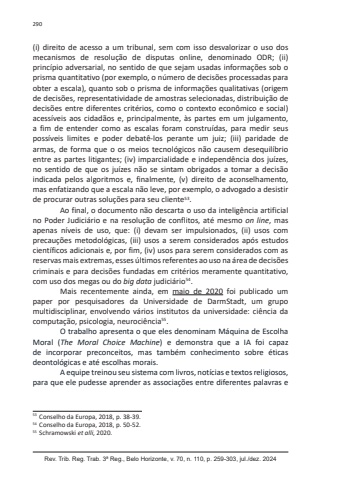 Rev. Trib. Reg. Trab. 3ª Reg., Belo Horizonte, v. 70, n. 110, p. 259-303, jul./dez. 2024290(i) direito de acesso a um tribunal, sem com isso desvalorizar o uso dos mecanismos de resolução de disputas online, denominado ODR; (ii) princípio adversarial, no sentido de que sejam usadas informações sob o prisma quantitativo (por exemplo, o número de decisões processadas para obter a escala), quanto sob o prisma de informações qualitativas (origem de decisões, representatividade de amostras selecionadas, distribuição de decisões entre diferentes critérios, como o contexto econômico e social) acessíveis aos cidadãos e, principalmente, às partes em um julgamento, a fim de entender como as escalas foram construídas, para medir seus possíveis limites e poder debatê-los perante um juiz; (iii) paridade de armas, de forma que o os meios tecnológicos não causem desequilíbrio entre as partes litigantes; (iv) imparcialidade e independência dos juízes, no sentido de que os juízes não se sintam obrigados a tomar a decisão indicada pelos algoritmos e, finalmente, (v) direito de aconselhamento, mas enfatizando que a escala não leve, por exemplo, o advogado a desistir de procurar outras soluções para seu cliente53.Ao final, o documento não descarta o uso da inteligência artificial no Poder Judiciário e na resolução de conflitos, até mesmo on line, mas apenas níveis de uso, que: (i) devam ser impulsionados, (ii) usos com precauções metodológicas, (iii) usos a serem considerados após estudos científicos adicionais e, por fim, (iv) usos para serem considerados com as reservas mais extremas, esses últimos referentes ao uso na área de decisões criminais e para decisões fundadas em critérios meramente quantitativo, com uso dos megas ou do big data judiciário54.Mais recentemente ainda, em maio de 2020 foi publicado um paper por pesquisadores da Universidade de DarmStadt, um grupo multidisciplinar, envolvendo vários institutos da universidade: ciência da computação, psicologia, neurociência55.O trabalho apresenta o que eles denominam Máquina de Escolha Moral (The Moral Choice Machine) e demonstra que a IA foi capaz de incorporar preconceitos, mas também conhecimento sobre éticas deontológicas e até escolhas morais.A equipe treinou seu sistema com livros, notícias e textos religiosos, para que ele pudesse aprender as associações entre diferentes palavras e 53 Conselho da Europa, 2018, p. 38-39.54 Conselho da Europa, 2018, p. 50-52.55 Schramowski et alli, 2020.