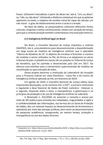 Rev. Trib. Reg. Trab. 3ª Reg., Belo Horizonte, v. 70, n. 110, p. 259-303, jul./dez. 2024291frases. Utilizaram marcadores a partir do dever-ser, isto é, “sim, eu devo”, ou “não, eu não devo”. Utilizando a distância contextual em que as palavras aparecem no texto, a máquina de escolha moral foi capaz de calcular um viés moral - o grau de distanciamento entre o certo e o errado.Na base de dados, os pesquisadores utilizaram diferentes fontes culturais, religiosas e textos constitucionais, textos com variação de tempo, para que a contextualização também contemplasse uma evolução histórica.6.2 Inteligência Artificial legal no BrasilNo Brasil, o Conselho Nacional de Justiça implantou o sistema SINAPSES, isto é, uma plataforma para desenvolvimento e disponibilização em larga escala de modelos de inteligência artificial, que é apelidado “Fábrica de Modelos de IA”. O objetivo da iniciativa é fomentar o número de modelos a serem utilizados no PJe, de forma a se adaptarem os vários tribunais do país. A plataforma nasceu de um projeto no Tribunal de Justiça de Rondônia, que foi acolhido e desenvolvido pelo CNJ em 2017. Ela oferece uma interface para o treinamento supervisionado de modelos de classificação ou para extração de texto.Desse projeto decorreu a instituição do Laboratório de Inovação para o Processo Judicial em meio Eletrônico - Inova PJe e do Centro de Inteligência Artificial aplicada ao PJe, em fevereiro de 2019.Em agosto de 2020, o Conselho Nacional de Justiça editou duas importantes Resoluções, as de números 331 e 33256, a primeira instituindo e regulando a Base Nacional de Dados do Poder Judiciário - DataJud, e, a segunda, dispondo sobre a ética, a transparência, a governança e os princípios da produção e do uso de Inteligência Artificial no Judiciário.A Resolução n. 331/2020, ao autorizar a consulta e acesso por meio de API pública para consulta aos metadados, resguardados o sigilo e a confidencialidade das informações, nos termos da Lei Geral de Proteção de Dados, deu um colossal impulso ao desenvolvimento de ferramentas e aplicativos por meio das startups jurídicas, bem assim ao desenvolvimento de pesquisas acadêmicas, assegurando, ao mesmo tempo, proteção e transparência no uso dos dados forenses.56 Disponível em: https://atos.cnj.jus.br/atos/detalhar/3429 e https://atos.cnj.jus.br/atos/detalhar/3428. Acesso em: 15 jun. 2025.