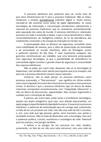 Rev. Trib. Reg. Trab. 3ª Reg., Belo Horizonte, v. 70, n. 110, p. 259-303, jul./dez. 2024293O processo eletrônico tem potencial para ser muito mais do que mera infraestrutura de TI para o processo tradicional. Não se reduz, tampouco, a simples procedimento judiciário digital e, muito menos, concebe-se tão somente como autos de papel digitalizados. As novas tecnologias de informação e comunicação transformam radicalmente a natureza do processo tradicional, que se caracteriza, primordialmente, pela separação dos autos do mundo. O processo eletrônico é, sobretudo, processo em rede e orientado a dados, o que o torna beneficiário e refém, concomitantemente, da inteligência coletiva, da lei da abundância, dos rendimentos crescentes e da sinergia da interação em tempo real.A preocupação deve se deslocar da segurança, concebida como mera estabilidade do sistema, para a ideia de preservação da intimidade e da privacidade no mundo eletrônico, além da blindagem contra o potencial opressor do Big Data. É mais importante assegurar tais garantias constitucionais aos cidadãos, que uma excessiva preocupação com segurança tecnológica, já que a possibilidade de redundância na comunidade digital constitui a grande chave da segurança e incolumidade dos arquivos eletrônicos.Não se pode, por outro lado, desprezar não só as tecnologias já disponíveis, mas também estar atento para aquelas que já se ensejam, sob pena de o processo eletrônico sempre nascer obsoleto.Insiste-se: não se pode pensar no processo eletrônico como processo escaneado, o “foto-processo” - que significa em última análise como mera migração (inclusive dos vícios) da escritura para o novo processo virtual. O decisivo é que o processo eletrônico seja um banco de dados relacional, manipulável semanticamente, com “integridade referencial”, e não um banco de documentos, segmentados. Mas, sempre registrando o cuidado com a mineração de dados.É preciso, por outro lado, evitar tanto o triunfalismo tecnológico, quanto seu duplo antagônico, qual seja, uma atitude obscurantista, um apelo piegas à especificidade da dignidade humana. O essencial no processo eletrônico, o potencial de emancipação que ele carrega está, justamente, no fato de ser um processo em rede, mas não uma rede de fios e circuitos, e, sim, uma rede que liga pessoas, gente, seres humanos: juiz, partes e sociedade humana. Não se trata de deslumbre com a tecnologia, mas com o potencial político, cultural, econômico e sociológico da rede. Potencial que traz avanços, mas perigos também.A beleza e os perigos de um processo em rede residem, justamente, no fato de ser não uma rede estrutural, mas uma rede de