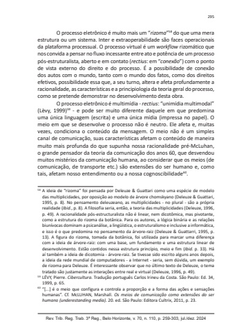 Rev. Trib. Reg. Trab. 3ª Reg., Belo Horizonte, v. 70, n. 110, p. 259-303, jul./dez. 2024295O processo eletrônico é muito mais um “rizoma”58 do que uma mera estrutura ou um sistema. Inter e extraoperabilidade são faces operacionais da plataforma processual. O processo virtual é um workflow rizomático que nos convida a pensar no fluxo incessante entre ato e potência de um processo pós-estruturalista, aberto e em contato (rectius: em “conexão”) com o ponto de vista externo do direito e do processo. É a possibilidade de conexão dos autos com o mundo, tanto com o mundo dos fatos, como dos direitos efetivos, possibilidade essa que, a seu turno, altera e afeta profundamente a racionalidade, as características e a principiologia da teoria geral do processo, como se pretende demonstrar no desenvolvimento desta obra.O processo eletrônico é multimídia - rectius: “unimídia multimodal” (Lèvy, 1999)59 - e pode ser muito diferente daquele em que predomina uma única linguagem (escrita) e uma única mídia (impressa no papel). O meio em que se desenvolve o processo não é neutro. Ele afeta e, muitas vezes, condiciona o conteúdo da mensagem. O meio não é um simples canal de comunicação, suas características afetam o conteúdo de maneira muito mais profunda do que supunha nossa racionalidade pré-McLuhan, o grande pensador da teoria da comunicação dos anos 60, que desvendou muitos mistérios da comunicação humana, ao considerar que os meios (de comunicação, de transporte etc.) são extensões do ser humano e, como tais, afetam nosso entendimento ou a nossa cognoscibilidade60.58 A ideia de “rizoma” foi pensada por Deleuze & Guattari como uma espécie de modelo das multiplicidades, por oposição ao modelo de árvore chomskyano (Deleuze & Guattari, 1995, p. 8). No pensamento deleuzeano, as multiplicidades - no plural - são a própria realidade (Ibid., p. 8). A filosofia seria, então, a teoria das multiplicidades (Deleuze, 1996, p. 49). A racionalidade pós-estructuralista não é linear, nem dicotômica, mas pivotante, como a estrutura do rizoma da botânica. Para os autores, a lógica binária e as relações biunívocas dominam a psicanálise, a lingüística, o estruturalismo e inclusive a informática, e isso é o que predomina no pensamento da árvore-raiz (Deleuze & Guattarri, 1995, p. 13). A figura do rizoma, tomada da botânica, foi utilizada para marcar uma diferença com a ideia de árvore-raiz: com uma base, um fundamento e uma estrutura linear de desenvolvimento. Estão contidos nessa estrutura princípio, meio e fim (Ibid. p. 33). Há aí também a ideia de dicotomia - árvore-raiz. Se tivesse sido escrito alguns anos depois, a ideia da rede mundial de computadores - a Internet - seria, sem dúvida, um exemplo de rizoma para Deleuze. É interessante observar que no último texto de Deleuze, o tema tratado são justamente as interações entre real e virtual (Deleuze, 1996, p. 49). 59 LÉVY, Pierre. Cibercultura. Tradução português Carlos Irineu da Costa. São Paulo: Ed. 34, 1999, p. 65. 60 “[...] é o meio que configura e controla a proporção e a forma das ações e sensações humanas”. Cf. McLUHAN, Marshall. Os meios de comunicação como extensões do ser humano (underestanding media). 20. ed. São Paulo: Editora Cultrix, 2011, p. 23.