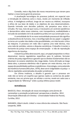 Rev. Trib. Reg. Trab. 3ª Reg., Belo Horizonte, v. 70, n. 110, p. 259-303, jul./dez. 2024296Conexão, meio e Big Data são novos mecanismos que vieram para habitar a nova teoria geral do processo.A atualização tecnológica do processo judicial, em especial com a introdução de sistemas como o Assis, revela um momento de inflexão crítica. A inteligência artificial, longe de ser neutra ou infalível, incorpora o ethos de sua base de dados e os objetivos de seus desenvolvedores. Quando treinada com decisões judiciais, ela perpetua seus vícios e virtudes. Por isso, mais do que nunca, é necessário um controle epistêmico e democrático sobre esses sistemas, com transparência, auditabilidade e inclusão da sociedade civil e da academia jurídica em sua construção e uso.A centralidade da IA na nova racionalidade processual não significa a obsolescência do humano, mas a reconfiguração do seu papel: o julgador se torna um curador dos dados e das possibilidades, um interlocutor crítico da máquina. O processo em rede não é apenas uma rede técnica, mas uma rede de sentidos, valores e disputas semânticas. O desafio é manter o horizonte da justiça como espaço de emancipação - e não de reprodução algorítmica da injustiça.A doutrina jurídica deve assumir, aqui, um papel propositivo e crítico: desenvolver marcos regulatórios específicos para IA judiciais, formular critérios de justiça algorítmica e garantir que os direitos fundamentais não se dissolvam no oceano estatístico dos mega dados. Como afirmado ao longo desta obra, o processo eletrônico não é apenas um meio técnico, mas um espaço de possibilidades políticas e epistêmicas. A tecnologia, como extensão da imanência humana (McLuhan, 1979), deve servir à dignidade e à justiça - e não às repetições automatizadas do poder jurisdicional.Em última instância, o desafio é garantir que o processo em rede não se torne um espelho que apenas repita os contornos do poder existente, mas um prisma que, ao refratar a norma, revele em cada caso a singularidade da “diferença” onde a justiça efetiva possa residir.REFERÊNCIASBAIOCCO, Elton. Introdução de novas tecnologias como forma de racionalizar a prestação jurisdicional: perspectivas e desafios. 2012. Dissertação (Mestrado em Direito) - Universidade Federal do Paraná, Curitiba, 2012.BARABÁSI, Albert-László. Linked: a nova ciência dos networks. São Paulo: Leopardo, 2009.