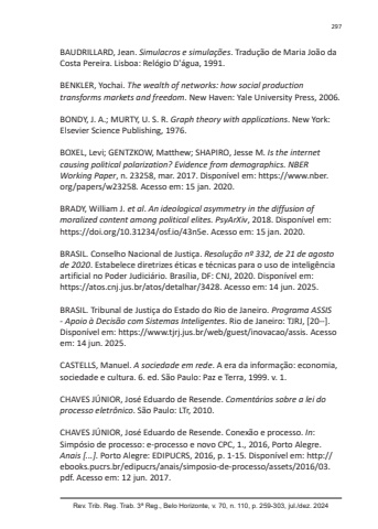 Rev. Trib. Reg. Trab. 3ª Reg., Belo Horizonte, v. 70, n. 110, p. 259-303, jul./dez. 2024297BAUDRILLARD, Jean. Simulacros e simulações. Tradução de Maria João da Costa Pereira. Lisboa: Relógio D'água, 1991.BENKLER, Yochai. The wealth of networks: how social production transforms markets and freedom. New Haven: Yale University Press, 2006.BONDY, J. A.; MURTY, U. S. R. Graph theory with applications. New York: Elsevier Science Publishing, 1976.BOXEL, Levi; GENTZKOW, Matthew; SHAPIRO, Jesse M. Is the internet causing political polarization? Evidence from demographics. NBER Working Paper, n. 23258, mar. 2017. Disponível em: https://www.nber.org/papers/w23258. Acesso em: 15 jan. 2020.BRADY, William J. et al. An ideological asymmetry in the diffusion of moralized content among political elites. PsyArXiv, 2018. Disponível em: https://doi.org/10.31234/osf.io/43n5e. Acesso em: 15 jan. 2020.BRASIL. Conselho Nacional de Justiça. Resolução nº 332, de 21 de agosto de 2020. Estabelece diretrizes éticas e técnicas para o uso de inteligência artificial no Poder Judiciário. Brasília, DF: CNJ, 2020. Disponível em: https://atos.cnj.jus.br/atos/detalhar/3428. Acesso em: 14 jun. 2025.BRASIL. Tribunal de Justiça do Estado do Rio de Janeiro. Programa ASSIS - Apoio à Decisão com Sistemas Inteligentes. Rio de Janeiro: TJRJ, [20--]. Disponível em: https://www.tjrj.jus.br/web/guest/inovacao/assis. Acesso em: 14 jun. 2025.CASTELLS, Manuel. A sociedade em rede. A era da informação: economia, sociedade e cultura. 6. ed. São Paulo: Paz e Terra, 1999. v. 1.CHAVES JÚNIOR, José Eduardo de Resende. Comentários sobre a lei do processo eletrônico. São Paulo: LTr, 2010.CHAVES JÚNIOR, José Eduardo de Resende. Conexão e processo. In: Simpósio de processo: e-processo e novo CPC, 1., 2016, Porto Alegre. Anais [...]. Porto Alegre: EDIPUCRS, 2016, p. 1-15. Disponível em: http://ebooks.pucrs.br/edipucrs/anais/simposio-de-processo/assets/2016/03.pdf. Acesso em: 12 jun. 2017.