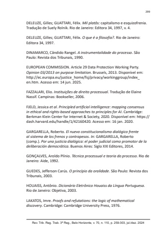 Rev. Trib. Reg. Trab. 3ª Reg., Belo Horizonte, v. 70, n. 110, p. 259-303, jul./dez. 2024299DELEUZE, Gilles; GUATTARI, Félix. Mil platôs: capitalismo e esquizofrenia. Tradução de Suely Rolnik. Rio de Janeiro: Editora 34, 1997, v. 4.DELEUZE, Gilles; GUATTARI, Félix. O que é a filosofia?. Rio de Janeiro: Editora 34, 1997.DINAMARCO, Cândido Rangel. A instrumentalidade do processo. São Paulo: Revista dos Tribunais, 1990.EUROPEAN COMMISSION. Article 29 Data Protection Working Party. Opinion 03/2013 on purpose limitation. Brussels, 2013. Disponível em: http://ec.europa.eu/justice_home/fsj/privacy/workinggroup/index_en.htm. Acesso em: 14 jun. 2025.FAZZALARI, Elio. Instituições de direito processual. Tradução de Elaine Nassif. Campinas: Bookseller, 2006.FJELD, Jessica et al. Principled artificial intelligence: mapping consensus in ethical and rights-based approaches to principles for AI. Cambridge: Berkman Klein Center for Internet & Society, 2020. Disponível em: https://dash.harvard.edu/handle/1/42160420. Acesso em: 16 jan. 2020.GARGARELLA, Roberto. El nuevo constitucionalismo dialógico frente al sistema de los frenos y contrapesos. In: GARGARELLA, Roberto (comp.). Por una justicia dialógica: el poder judicial como promotor de la deliberación democrática. Buenos Aires: Siglo XXI Editores, 2014.GONÇALVES, Aroldo Plínio. Técnica processual e teoria do processo. Rio de Janeiro: Aide, 1992.GUEDES, Jefferson Carús. O princípio da oralidade. São Paulo: Revista dos Tribunais, 2003.HOUAISS, Antônio. Dicionário Eletrônico Houaiss da Língua Portuguesa. Rio de Janeiro: Objetiva, 2003.LAKATOS, Imre. Proofs and refutations: the logic of mathematical discovery. Cambridge: Cambridge University Press, 1976.