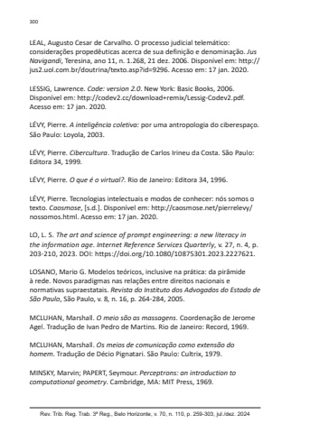 Rev. Trib. Reg. Trab. 3ª Reg., Belo Horizonte, v. 70, n. 110, p. 259-303, jul./dez. 2024300LEAL, Augusto Cesar de Carvalho. O processo judicial telemático: considerações propedêuticas acerca de sua definição e denominação. Jus Navigandi, Teresina, ano 11, n. 1.268, 21 dez. 2006. Disponível em: http://jus2.uol.com.br/doutrina/texto.asp?id=9296. Acesso em: 17 jan. 2020.LESSIG, Lawrence. Code: version 2.0. New York: Basic Books, 2006. Disponível em: http://codev2.cc/download+remix/Lessig-Codev2.pdf. Acesso em: 17 jan. 2020.LÉVY, Pierre. A inteligência coletiva: por uma antropologia do ciberespaço. São Paulo: Loyola, 2003.LÉVY, Pierre. Cibercultura. Tradução de Carlos Irineu da Costa. São Paulo: Editora 34, 1999.LÉVY, Pierre. O que é o virtual?. Rio de Janeiro: Editora 34, 1996.LÉVY, Pierre. Tecnologias intelectuais e modos de conhecer: nós somos o texto. Caosmose, [s.d.]. Disponível em: http://caosmose.net/pierrelevy/nossomos.html. Acesso em: 17 jan. 2020.LO, L. S. The art and science of prompt engineering: a new literacy in the information age. Internet Reference Services Quarterly, v. 27, n. 4, p. 203-210, 2023. DOI: https://doi.org/10.1080/10875301.2023.2227621.LOSANO, Mario G. Modelos teóricos, inclusive na prática: da pirâmide à rede. Novos paradigmas nas relações entre direitos nacionais e normativas supraestatais. Revista do Instituto dos Advogados do Estado de São Paulo, São Paulo, v. 8, n. 16, p. 264-284, 2005.MCLUHAN, Marshall. O meio são as massagens. Coordenação de Jerome Agel. Tradução de Ivan Pedro de Martins. Rio de Janeiro: Record, 1969.MCLUHAN, Marshall. Os meios de comunicação como extensão do homem. Tradução de Décio Pignatari. São Paulo: Cultrix, 1979.MINSKY, Marvin; PAPERT, Seymour. Perceptrons: an introduction to computational geometry. Cambridge, MA: MIT Press, 1969.