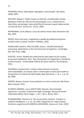 Rev. Trib. Reg. Trab. 3ª Reg., Belo Horizonte, v. 70, n. 110, p. 259-303, jul./dez. 2024302PIGNATARI, Décio. Informação, linguagem, comunicação. São Paulo: Ateliê, 2003.RECUERO, Raquel C. Redes sociais na internet: considerações iniciais. Biblioteca Online de Ciências da Comunicação, [s.d.]. Disponível em: http://bocc.ubi.pt/pag/_texto.php3?html2=recuero-raquel-redes-sociaisna-internet.html. Acesso em: 14 jun. 2009.ROHRMANN, Carlos Alberto. Curso de direito virtual. Belo Horizonte: Del Rey, 2005.ROVER, Aires José (org.). Engenharia e gestão do judiciário brasileiro: estudos sobre e-justiça. Erechim: Edifapes, 2016.RUMELHART, David E.; MCCLELLAND, James L. Parallel distributed processing: explorations in the microstructure of cognition. Cambridge, MA: MIT Press, 1986.RUSCHEL, Airton. Modelo de conhecimento para apoio ao juiz na fase processual trabalhista. 2012. Tese (Doutorado em Engenharia e Gestão do Conhecimento) - Universidade Federal de Santa Catarina, Florianópolis, 2012.SALDANHA, Gustavo Silva. A leitura informacional na teia da intermedialidade: um estudo sobre a informação no texto pós-moderno. Perspectivas em Ciência da Informação, Belo Horizonte, v. 13, n. 1, p. 55-66, 2008.SANTOS, Moacyr Amaral. Prova judiciária no cível e comercial. São Paulo: Max Limonad, 1970.SCHERTEL MENDES, Laura; MATTIUZZO, Marcela. Discriminação algorítmica: conceito, fundamento legal e tipologia. Revista de Direito Urbanístico (RDU), Porto Alegre, v. 16, n. 90, p. 39-64, 2019.SCHRAMOWSKI, Patrick et al. The moral choice machine. Frontiers in artificial intelligence, v. 3, art. 36, 2020. Disponível em: https://www.frontiersin.org/article/10.3389/frai.2020.00036. Acesso em: 8 set. 2020.
