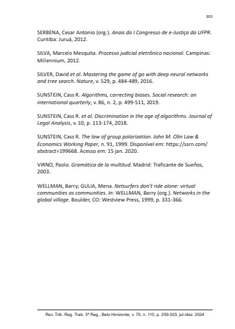 Rev. Trib. Reg. Trab. 3ª Reg., Belo Horizonte, v. 70, n. 110, p. 259-303, jul./dez. 2024303SERBENA, Cesar Antonio (org.). Anais do I Congresso de e-Justiça da UFPR. Curitiba: Juruá, 2012.SILVA, Marcelo Mesquita. Processo judicial eletrônico nacional. Campinas: Millennium, 2012.SILVER, David et al. Mastering the game of go with deep neural networks and tree search. Nature, v. 529, p. 484-489, 2016.SUNSTEIN, Cass R. Algorithms, correcting biases. Social research: an international quarterly, v. 86, n. 2, p. 499-511, 2019.SUNSTEIN, Cass R. et al. Discrimination in the age of algorithms. Journal of Legal Analysis, v. 10, p. 113-174, 2018.SUNSTEIN, Cass R. The law of group polarization. John M. Olin Law & Economics Working Paper, n. 91, 1999. Disponível em: https://ssrn.com/abstract=199668. Acesso em: 15 jan. 2020.VIRNO, Paolo. Gramática de la multitud. Madrid: Traficante de Sueños, 2003.WELLMAN, Barry; GULIA, Mena. Netsurfers don’t ride alone: virtual communities as communities. In: WELLMAN, Barry (org.). Networks in the global village. Boulder, CO: Westview Press, 1999, p. 331-366.
