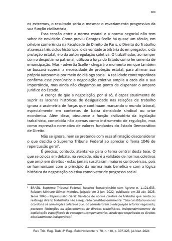 309Rev. Trib. Reg. Trab. 3ª Reg., Belo Horizonte, v. 70, n. 110, p. 307-326, jul./dez. 2024os extremos, o resultado seria o mesmo: o esvaziamento progressivo da sua função civilizatória.Essa tensão entre a norma estatal e a norma negocial não tem sabor de novidade. Como previu Georges Scelle há quase um século, em célebre conferência na Faculdade de Direito de Paris, o Direito do Trabalho atravessa três ciclos históricos: o da vontade arbitrária do empregador; o da proteção estatal; e o da autorregulação coletiva. O trabalhador, ao romper com o despotismo patronal, utilizou a força do Estado como ferramenta de emancipação. Mas - advertia Scelle - chegará o momento em que também se buscará superar a necessidade de proteção estatal, para afirmar sua própria autonomia por meio do diálogo social. A realidade contemporânea confirma esse prenúncio: a negociação coletiva amplia a cada dia a sua importância, mas ainda não chegamos ao ponto de dispensar o amparo jurídico do Estado.A crença de que a negociação, por si só, é capaz atualmente de suprir as lacunas históricas de desigualdade nas relações de trabalho ignora a assimetria de forças que continuam marcando o mundo laboral, especialmente em contextos de baixa densidade sindical ou crise econômica. Além disso, obscurece a função civilizatória da legislação trabalhista, concebida não apenas como instrumento de regulação, mas como expressão normativa de valores fundantes do Estado Democrático de Direito.Não se ignora, nem se pretende com essa afirmação desconsiderar o que decidiu o Supremo Tribunal Federal ao apreciar o Tema 1046 de repercussão geral1.É preciso, contudo, atentar-se para o tema central desta tese. O que se coloca em debate, na verdade, não é a validade de normas coletivas que ampliem direitos - estas jamais suscitaram maiores controvérsias, pois se harmonizam com o princípio da norma mais benéfica e com a lógica histórica da negociação coletiva como vetor de progresso social.1 BRASIL. Supremo Tribunal Federal. Recurso Extraordinário com Agravo n. 1.121.633, Relator: Ministro Gilmar Mendes, julgado em 2 jun. 2022, publicado em 28 abr. 2023. Tema 1046 - Repercussão Geral: Validade de norma coletiva de trabalho que limita ou restringe direito trabalhista não assegurado constitucionalmente: “São constitucionais os acordos e as convenções coletivos que, ao considerarem a adequação setorial negociada, pactuam limitações ou afastamentos de direitos trabalhistas, independentemente da explicitação especificada de vantagens compensatórias, desde que respeitados os direitos absolutamente indisponíveis”.