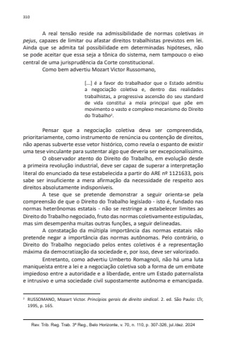 310Rev. Trib. Reg. Trab. 3ª Reg., Belo Horizonte, v. 70, n. 110, p. 307-326, jul./dez. 2024A real tensão reside na admissibilidade de normas coletivas in pejus, capazes de limitar ou afastar direitos trabalhistas previstos em lei. Ainda que se admita tal possibilidade em determinadas hipóteses, não se pode aceitar que essa seja a tônica do sistema, nem tampouco o eixo central de uma jurisprudência da Corte constitucional.Como bem advertiu Mozart Victor Russomano,[...] é a favor do trabalhador que o Estado admitiu a negociação coletiva e, dentro das realidades trabalhistas, a progressiva ascensão do seu standard de vida constitui a mola principal que põe em movimento o vasto e complexo mecanismo do Direito do Trabalho2.Pensar que a negociação coletiva deva ser compreendida, prioritariamente, como instrumento de renúncia ou contenção de direitos, não apenas subverte esse vetor histórico, como revela o espanto de existir uma tese vinculante para sustentar algo que deveria ser excepcionalíssimo.O observador atento do Direito do Trabalho, em evolução desde a primeira revolução industrial, deve ser capaz de superar a interpretação literal do enunciado da tese estabelecida a partir do ARE nº 1121633, pois sabe ser insuficiente a mera afirmação da necessidade de respeito aos direitos absolutamente indisponíveis.A tese que se pretende demonstrar a seguir orienta-se pela compreensão de que o Direito do Trabalho legislado - isto é, fundado nas normas heterônomas estatais - não se restringe a estabelecer limites ao Direito do Trabalho negociado, fruto das normas coletivamente estipuladas, mas sim desempenha muitas outras funções, a seguir delineadas.A constatação da múltipla importância das normas estatais não pretende negar a importância das normas autônomas. Pelo contrário, o Direito do Trabalho negociado pelos entes coletivos é a representação máxima da democratização da sociedade e, por isso, deve ser valorizado.Entretanto, como advertiu Umberto Romagnoli, não há uma luta maniqueísta entre a lei e a negociação coletiva sob a forma de um embate impiedoso entre a autoridade e a liberdade, entre um Estado paternalista e intrusivo e uma sociedade civil supostamente autônoma e emancipada. 2 RUSSOMANO, Mozart Victor. Princípios gerais de direito sindical. 2. ed. São Paulo: LTr, 1995, p. 165.