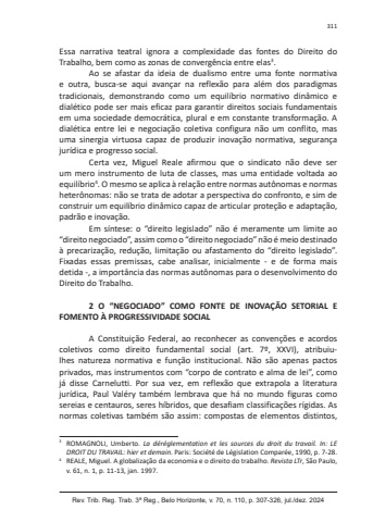 311Rev. Trib. Reg. Trab. 3ª Reg., Belo Horizonte, v. 70, n. 110, p. 307-326, jul./dez. 2024Essa narrativa teatral ignora a complexidade das fontes do Direito do Trabalho, bem como as zonas de convergência entre elas3.Ao se afastar da ideia de dualismo entre uma fonte normativa e outra, busca-se aqui avançar na reflexão para além dos paradigmas tradicionais, demonstrando como um equilíbrio normativo dinâmico e dialético pode ser mais eficaz para garantir direitos sociais fundamentais em uma sociedade democrática, plural e em constante transformação. A dialética entre lei e negociação coletiva configura não um conflito, mas uma sinergia virtuosa capaz de produzir inovação normativa, segurança jurídica e progresso social.Certa vez, Miguel Reale afirmou que o sindicato não deve ser um mero instrumento de luta de classes, mas uma entidade voltada ao equilíbrio4. O mesmo se aplica à relação entre normas autônomas e normas heterônomas: não se trata de adotar a perspectiva do confronto, e sim de construir um equilíbrio dinâmico capaz de articular proteção e adaptação, padrão e inovação.Em síntese: o “direito legislado” não é meramente um limite ao “direito negociado”, assim como o “direito negociado” não é meio destinado à precarização, redução, limitação ou afastamento do “direito legislado”. Fixadas essas premissas, cabe analisar, inicialmente - e de forma mais detida -, a importância das normas autônomas para o desenvolvimento do Direito do Trabalho.2 O “NEGOCIADO” COMO FONTE DE INOVAÇÃO SETORIAL E FOMENTO À PROGRESSIVIDADE SOCIALA Constituição Federal, ao reconhecer as convenções e acordos coletivos como direito fundamental social (art. 7º, XXVI), atribuiulhes natureza normativa e função institucional. Não são apenas pactos privados, mas instrumentos com “corpo de contrato e alma de lei”, como já disse Carnelutti. Por sua vez, em reflexão que extrapola a literatura jurídica, Paul Valéry também lembrava que há no mundo figuras como sereias e centauros, seres híbridos, que desafiam classificações rígidas. As normas coletivas também são assim: compostas de elementos distintos, 3 ROMAGNOLI, Umberto. La déréglementation et les sources du droit du travail. In: LE DROIT DU TRAVAIL: hier et demain. Paris: Société de Législation Comparée, 1990, p. 7-28. 4 REALE, Miguel. A globalização da economia e o direito do trabalho. Revista LTr, São Paulo, v. 61, n. 1, p. 11-13, jan. 1997.