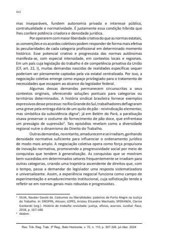 312Rev. Trib. Reg. Trab. 3ª Reg., Belo Horizonte, v. 70, n. 110, p. 307-326, jul./dez. 2024mas inseparáveis, fundem autonomia privada e interesse público, contratualidade e normatividade. É justamente essa condição híbrida que lhes confere potência criadora e densidade jurídica.Por operarem com maior liberdade criativa do que as normas estatais, as convenções e os acordos coletivos podem responder de forma mais efetiva às peculiaridades de cada categoria profissional em determinado momento histórico. Esse potencial criativo e progressista das normas autônomas manifesta-se, com especial intensidade, em contextos locais e regionais. Em um país cuja legislação do trabalho é de competência privativa da União (CF, art. 22, I), muitas demandas nascidas de realidades específicas sequer poderiam ser plenamente captadas pela via estatal centralizada. Por isso, a negociação coletiva emerge como espaço privilegiado para o tratamento de necessidades que escapam ao alcance do legislador federal.Algumas dessas demandas permanecem circunscritas a seus contextos originais, oferecendo soluções pontuais para categorias ou territórios determinados. A história sindical brasileira fornece exemplos expressivos desse processo: no Rio Grande do Sul, trabalhadores deflagraram uma greve pela entrega diária de um quilo de pão - reivindicação elementar, mas simbólica da subsistência digna5; já em Belém do Pará, a paralisação visava preservar o costume do fornecimento de pão doce, que enfrentava um presságio de supressão6. Tais episódios revelam como a diversidade regional nutre o dinamismo do Direito do Trabalho.Outras demandas, no entanto, amadurecem e se irradiam, ganhando densidade normativa suficiente para influenciar o ordenamento jurídico de modo mais amplo. A negociação coletiva opera como força propulsora de inovação normativa, promovendo a progressividade social por meio de conquistas que tendem à generalização. As conquistas que se mostram bem-sucedidas em determinados setores frequentemente se irradiam para outras categorias, criando uma trajetória ascendente de direitos que, com o tempo, passa a demandar do legislador uma resposta sistematizadora e universalizante. Assim, a experiência negocial funciona como campo de experimentação e amadurecimento institucional, cuja sofisticação tende a refletir-se em normas gerais mais robustas e progressistas.5 SILVA, Nauber Gavski da. Costumes ou liberalidades: padeiros de Porto Alegre na Justiça do Trabalho. In: DROPPA, Alisson; LOPES, Aristeu Elisandro Machado; SPERANZA, Clarice Gontarski (org.). História do trabalho revisitada: justiça, ofícios, acervos. Jundiaí: Paco, 2018, p. 167-188. 6 Ibidem.