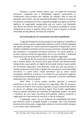 319Rev. Trib. Reg. Trab. 3ª Reg., Belo Horizonte, v. 70, n. 110, p. 307-326, jul./dez. 2024Portanto, a norma estatal exerce, aqui, um papel de contenção estrutural, impedindo que a flexibilidade negocial comprometa os fundamentos ético-jurídicos das relações de trabalho. Não se trata de oposição entre fontes, mas de complementaridade funcional: ao garantir um patamar civilizatório mínimo, o legislado protege os próprios contornos legítimos da negociação, assegurando que ela ocorra com liberdade, mas dentro dos limites da justiça social. A função de proteção ao núcleo indisponível é, assim, a espinha dorsal sobre a qual se erguem as demais dimensões da arquitetura normativa do trabalho.b) Constituição de um ecossistema normativo equilibradoA segunda função das normas estatais é a de organizar e estabilizar o campo normativo no qual a negociação coletiva se realiza. O direito legislado não apenas protege um núcleo essencial de garantias indisponíveis, como também estabelece as balizas estruturais que permitem a atuação legítima dos sindicatos e a produção normativa autônoma. Em outras palavras, a lei não é apenas o limite da negociação: ela é o seu solo fértil, o ambiente institucional que torna possível a criação de soluções negociadas.A existência de um ecossistema normativo equilibrado pressupõe que o sistema defina, de maneira clara, quais direitos são absolutamente indisponíveis, quais podem ser objeto de transação relativa e quais podem ser livremente negociados. Essa distinção, ainda que não seja perene, é indispensável para evitar tanto a rigidez excessiva quanto a permissividade normativa. É a partir desse “mapa normativo” que os atores sociais conseguem identificar o alcance e os limites de sua autonomia negocial, conferindo previsibilidade ao processo e reduzindo o risco de invalidações posteriores por controle judicial.Além disso, a norma estatal também desenha o contorno institucional em que se dá o exercício da negociação. Não há, portanto, um vácuo normativo: há um campo regulado, no qual a autonomia coletiva se exerce em diálogo com preceitos legais. Essa função equilibradora adquire especial relevância em contextos de fragilidade sindical, nos quais a ausência de uma base normativa pré-existente poderia converter a negociação em instrumento de renúncia, e não de conquista.A legislação, assim, cria um ambiente de estabilidade normativa que favorece tanto a proteção quanto a inovação. Sem esse ambiente previamente estruturado, a negociação coletiva se tornaria volátil, desigual e, em muitos casos, disfuncional.