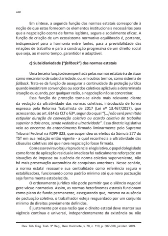 320Rev. Trib. Reg. Trab. 3ª Reg., Belo Horizonte, v. 70, n. 110, p. 307-326, jul./dez. 2024Em síntese, a segunda função das normas estatais corresponde à noção de que estas fornecem os elementos institucionais necessários para que a negociação ocorra de forma legítima, segura e socialmente eficaz. A função de criação de um ecossistema normativo equilibrado é, portanto, indispensável para a harmonia entre fontes, para a previsibilidade das relações de trabalho e para a construção progressiva de um direito social que seja, ao mesmo tempo, garantidor e adaptável.c) Subsidiariedade (“fallback”) das normas estataisUma terceira função desempenhada pelas normas estatais é a de atuar como mecanismo de subsidiariedade, ou, em outros termos, como sistema de fallback. Trata-se da função de assegurar a continuidade da proteção jurídica quando inexistirem convenções ou acordos coletivos aplicáveis a determinada situação ou quando, por qualquer razão, a negociação não se concretizar.Essa função de proteção torna-se ainda mais relevante diante da vedação da ultratividade das normas coletivas, introduzida de forma expressa pela Reforma Trabalhista de 2017 (Lei nº 13.467/2017), que acrescentou ao art. 614 da CLT o §3º, segundo o qual “[...] não será permitido estipular duração de convenção coletiva ou acordo coletivo de trabalho superior a dois anos, sendo vedada a ultratividade”. Essa diretriz legislativa veio ao encontro do entendimento firmado liminarmente pelo Supremo Tribunal Federal na ADPF 323, que suspendeu os efeitos da Súmula 277 do TST em sua redação então vigente - a qual reconhecia a ultratividade das cláusulas coletivas até que nova negociação fosse firmada.Com essa reviravolta jurisprudencial e legislativa, o papel do legislado como fonte de aplicação residual e imediata foi radicalmente reforçado: em situações de impasse ou ausência de norma coletiva superveniente, não há mais preservação automática de conquistas anteriores. Nesse cenário, a norma estatal reassume sua centralidade como referência segura e estabilizadora, funcionando como padrão mínimo até que nova pactuação seja formalmente estabelecida.O ordenamento jurídico não pode permitir que o silêncio negocial gere vácuo normativo. Assim, as normas heterônomas estatais funcionam como plano de fundo permanente, assegurando que, mesmo na ausência de pactuação coletiva, o trabalhador esteja resguardado por um conjunto mínimo de direitos previamente definidos.É justamente por essa razão que o direito estatal deve manter sua vigência contínua e universal, independentemente da existência ou não