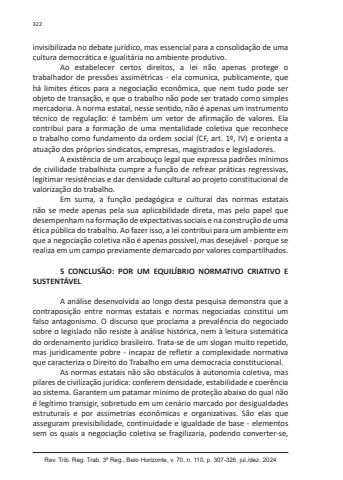 322Rev. Trib. Reg. Trab. 3ª Reg., Belo Horizonte, v. 70, n. 110, p. 307-326, jul./dez. 2024invisibilizada no debate jurídico, mas essencial para a consolidação de uma cultura democrática e igualitária no ambiente produtivo.Ao estabelecer certos direitos, a lei não apenas protege o trabalhador de pressões assimétricas - ela comunica, publicamente, que há limites éticos para a negociação econômica, que nem tudo pode ser objeto de transação, e que o trabalho não pode ser tratado como simples mercadoria. A norma estatal, nesse sentido, não é apenas um instrumento técnico de regulação: é também um vetor de afirmação de valores. Ela contribui para a formação de uma mentalidade coletiva que reconhece o trabalho como fundamento da ordem social (CF, art. 1º, IV) e orienta a atuação dos próprios sindicatos, empresas, magistrados e legisladores.A existência de um arcabouço legal que expressa padrões mínimos de civilidade trabalhista cumpre a função de refrear práticas regressivas, legitimar resistências e dar densidade cultural ao projeto constitucional de valorização do trabalho.Em suma, a função pedagógica e cultural das normas estatais não se mede apenas pela sua aplicabilidade direta, mas pelo papel que desempenham na formação de expectativas sociais e na construção de uma ética pública do trabalho. Ao fazer isso, a lei contribui para um ambiente em que a negociação coletiva não é apenas possível, mas desejável - porque se realiza em um campo previamente demarcado por valores compartilhados.5 CONCLUSÃO: POR UM EQUILÍBRIO NORMATIVO CRIATIVO E SUSTENTÁVELA análise desenvolvida ao longo desta pesquisa demonstra que a contraposição entre normas estatais e normas negociadas constitui um falso antagonismo. O discurso que proclama a prevalência do negociado sobre o legislado não resiste à análise histórica, nem à leitura sistemática do ordenamento jurídico brasileiro. Trata-se de um slogan muito repetido, mas juridicamente pobre - incapaz de refletir a complexidade normativa que caracteriza o Direito do Trabalho em uma democracia constitucional.As normas estatais não são obstáculos à autonomia coletiva, mas pilares de civilização jurídica: conferem densidade, estabilidade e coerência ao sistema. Garantem um patamar mínimo de proteção abaixo do qual não é legítimo transigir, sobretudo em um cenário marcado por desigualdades estruturais e por assimetrias econômicas e organizativas. São elas que asseguram previsibilidade, continuidade e igualdade de base - elementos sem os quais a negociação coletiva se fragilizaria, podendo converter-se,