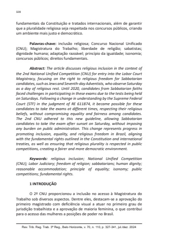 328Rev. Trib. Reg. Trab. 3ª Reg., Belo Horizonte, v. 70, n. 110, p. 327-341, jul./dez. 2024fundamentais da Constituição e tratados internacionais, além de garantir que a pluralidade religiosa seja respeitada nos concursos públicos, criando um ambiente mais justo e democrático.Palavras-chave: inclusão religiosa; Concurso Nacional Unificado (CNU); Magistratura do Trabalho; liberdade de religião; sabatistas; dignidade humana; adaptação razoável; princípio da igualdade; isonomia; concursos públicos; direitos fundamentais.Abstract: The article discusses religious inclusion in the context of the 2nd National Unified Competition (CNU) for entry into the Labor Court Magistracy, focusing on the right to religious freedom for Sabbatarian candidates, such as Jews and Seventh-day Adventists, who observe Saturday as a day of religious rest. Until 2020, candidates from Sabbatarian faiths faced challenges in participating in these exams due to the tests being held on Saturdays. Following a change in understanding by the Supreme Federal Court (STF) in the judgment of RE 611874, it became possible for these candidates to take the exams at different times, respecting their religious beliefs, without compromising equality and fairness among candidates. The 2nd CNU adhered to this new guideline, allowing Sabbatarian candidates to take the exam after sunset on Saturday, without imposing any burden on public administration. This change represents progress in promoting inclusion, equality, and religious freedom in Brazil, aligning with the fundamental rights outlined in the Constitution and international treaties, as well as ensuring that religious plurality is respected in public competitions, creating a fairer and more democratic environment.Keywords: religious inclusion; National Unified Competition (CNU); Labor Judiciary; freedom of religion; sabbatarians; human dignity; reasonable accommodation; principle of equality; isonomy; public competitions; fundamental rights.1 INTRODUÇÃOO 2º CNU proporcionou a inclusão no acesso à Magistratura do Trabalho sob diversos aspectos. Dentre eles, destacam-se a aprovação do primeiro magistrado com deficiência visual a atuar no primeiro grau de jurisdição trabalhista e a aprovação de maioria feminina, o que contribui para o acesso das mulheres a posições de poder no Brasil.