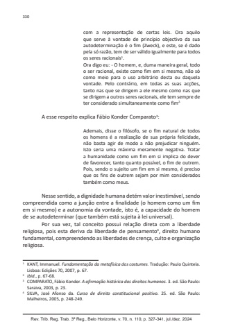 330Rev. Trib. Reg. Trab. 3ª Reg., Belo Horizonte, v. 70, n. 110, p. 327-341, jul./dez. 2024com a representação de certas leis. Ora aquilo que serve à vontade de princípio objectivo da sua autodeterminação é o fim (Zweck), e este, se é dado pela só razão, tem de ser válido igualmente para todos os seres racionais1.Ora digo eu: - O homem, e, duma maneira geral, todo o ser racional, existe como fim em si mesmo, não só como meio para o uso arbitrário desta ou daquela vontade. Pelo contrário, em todas as suas acções, tanto nas que se dirigem a ele mesmo como nas que se dirigem a outros seres racionais, ele tem sempre de ter considerado simultaneamente como fim2.A esse respeito explica Fábio Konder Comparato3:Ademais, disse o filósofo, se o fim natural de todos os homens é a realização de sua própria felicidade, não basta agir de modo a não prejudicar ninguém. Isto seria uma máxima meramente negativa. Tratar a humanidade como um fim em si implica do dever de favorecer, tanto quanto possível, o fim de outrem. Pois, sendo o sujeito um fim em si mesmo, é preciso que os fins de outrem sejam por mim considerados também como meus.Nesse sentido, a dignidade humana detém valor inestimável, sendo compreendida como a junção entre a finalidade (o homem como um fim em si mesmo) e a autonomia da vontade, isto é, a capacidade do homem de se autodeterminar (que também está sujeita à lei universal).Por sua vez, tal conceito possui relação direta com a liberdade religiosa, pois esta deriva da liberdade de pensamento4, direito humano fundamental, compreendendo as liberdades de crença, culto e organização religiosa.1 KANT, Immanuel. Fundamentação da metafísica dos costumes. Tradução: Paulo Quintela. Lisboa: Edições 70, 2007, p. 67. 2 Ibid., p. 67-68. 3 COMPARATO, Fábio Konder. A afirmação histórica dos direitos humanos. 3. ed. São Paulo: Saraiva, 2003, p. 23. 4 SILVA, José Afonso da. Curso de direito constitucional positivo. 25. ed. São Paulo: Malheiros, 2005, p. 248-249.