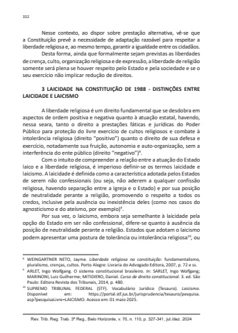 332Rev. Trib. Reg. Trab. 3ª Reg., Belo Horizonte, v. 70, n. 110, p. 327-341, jul./dez. 2024Nesse contexto, ao dispor sobre prestação alternativa, vê-se que a Constituição prevê a necessidade de adaptação razoável para respeitar a liberdade religiosa e, ao mesmo tempo, garantir a igualdade entre os cidadãos.Desta forma, ainda que formalmente sejam previstas as liberdades de crença, culto, organização religiosa e de expressão, a liberdade de religião somente será plena se houver respeito pelo Estado e pela sociedade e se o seu exercício não implicar redução de direitos.3 LAICIDADE NA CONSTITUIÇÃO DE 1988 - DISTINÇÕES ENTRE LAICIDADE E LAICISMOA liberdade religiosa é um direito fundamental que se desdobra em aspectos de ordem positiva e negativa quanto à atuação estatal, havendo, nessa seara, tanto o direito a prestações fáticas e jurídicas do Poder Público para proteção do livre exercício de cultos religiosos e combate à intolerância religiosa (direito “positivo”) quanto o direito de sua defesa e exercício, notadamente sua fruição, autonomia e auto-organização, sem a interferência do ente público (direito “negativo”)8.Com o intuito de compreender a relação entre a atuação do Estado laico e a liberdade religiosa, é imperioso definir-se os termos laicidade e laicismo. A laicidade é definida como a característica adotada pelos Estados de serem não confessionais (ou seja, não aderem a qualquer confissão religiosa, havendo separação entre a Igreja e o Estado) e por sua posição de neutralidade perante a religião, promovendo o respeito a todos os credos, inclusive pela ausência ou inexistência deles (como nos casos do agnosticismo e do ateísmo, por exemplo)9.Por sua vez, o laicismo, embora seja semelhante à laicidade pela opção do Estado em ser não confessional, difere-se quanto à ausência da posição de neutralidade perante a religião. Estados que adotam o laicismo podem apresentar uma postura de tolerância ou intolerância religiosa10, ou 8 WEINGARTNER NETO, Jayme. Liberdade religiosa na constituição: fundamentalismo, pluralismo, crenças, cultos. Porto Alegre: Livraria do Advogado Editora, 2007, p. 72 e ss. 9 ARLET, Ingo Wolfgang. O sistema constitucional brasileiro. In: SARLET, Ingo Wolfgang; MARINONI, Luiz Guilherme; MITIDIERO, Daniel. Curso de direito constitucional. 3. ed. São Paulo: Editora Revista dos Tribunais, 2014, p. 480. 10 SUPREMO TRIBUNAL FEDERAL (STF). Vocabulário Jurídico (Tesauro). Laicismo. Disponível em: https://portal.stf.jus.br/jurisprudencia/tesauro/pesquisa.asp?pesquisaLivre=LAICISMO. Acesso em: 01 maio 2025.