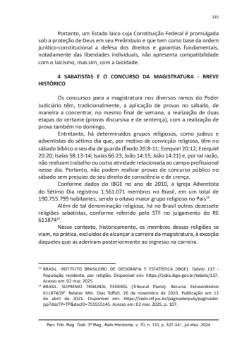 335Rev. Trib. Reg. Trab. 3ª Reg., Belo Horizonte, v. 70, n. 110, p. 327-341, jul./dez. 2024Portanto, um Estado laico cuja Constituição Federal é promulgada sob a proteção de Deus em seu Preâmbulo e que tem como base da ordem jurídico-constitucional a defesa dos direitos e garantias fundamentais, notadamente das liberdades individuais, não apresenta compatibilidade com o laicismo, mas sim, com a laicidade.4 SABATISTAS E O CONCURSO DA MAGISTRATURA - BREVE HISTÓRICOOs concursos para a magistratura nos diversos ramos do Poder Judiciário têm, tradicionalmente, a aplicação de provas no sábado, de maneira a concentrar, no mesmo final de semana, a realização de duas etapas do certame (provas discursiva e de sentença), com a realização de prova também no domingo.Entretanto, há determinados grupos religiosos, como judeus e adventistas do sétimo dia que, por motivo de convicção religiosa, têm no sábado bíblico o seu dia de guarda (Êxodo 20:8-11; Ezequiel 20:12; Ezequiel 20:20; Isaías 58:13-14; Isaías 66:23; João 14:15; João 14:21) e, por tal razão, não realizam trabalho ou outra atividade relacionada ao campo profissional nesse dia. Portanto, não podem realizar provas de concurso público no sábado sem prejuízo do seu direito de consciência e de crença.Conforme dados do IBGE no ano de 2010, a Igreja Adventista do Sétimo Dia registrou 1.561.071 membros no Brasil, em um total de 190.755.799 habitantes, sendo o oitavo maior grupo religioso no País14.Além de tal denominação religiosa, há no Brasil outras dezessete religiões sabatistas, conforme referido pelo STF no julgamento do RE 61187415.Nesse contexto, historicamente, os membros dessas religiões se viam, na prática, excluídos de alcançar a carreira da magistratura, à exceção daqueles que as aderiram posteriormente ao ingresso na carreira.14 BRASIL. INSTITUTO BRASILEIRO DE GEOGRAFIA E ESTATÍSTICA (IBGE). Tabela 137 - População residente, por religião. Disponível em: https://sidra.ibge.gov.br/tabela/137. Acesso em: 02 mar. 2025. 15 BRASIL. SUPREMO TRIBUNAL FEDERAL (Tribunal Pleno). Recurso Extraordinário 611874/DF. Relator Min. Dias Toffoli, 26 de novembro de 2020. Publicação em 12 de abril de 2021. Disponível em: https://redir.stf.jus.br/paginadorpub/paginador.jsp?docTP=TP&docID=755555145. Acesso em: 02 mar. 2025, p. 107.