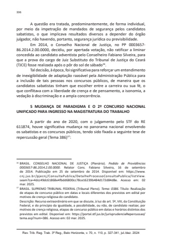 336Rev. Trib. Reg. Trab. 3ª Reg., Belo Horizonte, v. 70, n. 110, p. 327-341, jul./dez. 2024A questão era tratada, predominantemente, de forma individual, por meio da impetração de mandados de segurança pelos candidatos sabatistas, o que implicava resultados diversos a depender do órgão julgador, não havendo, portanto, segurança jurídica ou previsibilidade.Em 2014, o Conselho Nacional de Justiça, no PP 0003657-86.2014.2.00.0000, decidiu, por apertada votação, não ratificar a liminar concedida ao candidato adventista pelo Conselheiro Fabiano Silveira, para que a prova do cargo de Juiz Substituto do Tribunal de Justiça do Ceará (TJCE) fosse realizada após o pôr do sol de sábado16.Tal decisão, à época, foi significativa para reforçar um entendimento de inexigibilidade de adaptação razoável pela Administração Pública para a inclusão de tais pessoas nos concursos públicos, de maneira que os candidatos sabatistas tinham que escolher entre a carreira ou sua fé, o que conflitava com a liberdade de crença e de pensamento, a isonomia, a vedação à discriminação e a ampla concorrência.5 MUDANÇA DE PARADIGMA E O 2º CONCURSO NACIONAL UNIFICADO PARA INGRESSO NA MAGISTRATURA DO TRABALHOA partir do ano de 2020, com o julgamento pelo STF do RE 611874, houve significativa mudança no panorama nacional envolvendo os sabatistas e os concursos públicos, tendo sido fixada a seguinte tese de repercussão geral (Tema 386)17:16 BRASIL. CONSELHO NACIONAL DE JUSTIÇA (Plenário). Pedido de Providências 0003657-86.2014.2.00.0000. Relator Cons. Fabiano Silveira, 16 de setembro de 2014. Publicação em 25 de setembro de 2014. Disponível em: https://www.cnj.jus.br/pjecnj/ConsultaPublica/DetalheProcessoConsultaPublica/listView.seam?ca=4dcc49dc61868e4fbdd6800cc78ce16239b484d172d84d8e. Acesso em: 02 mar. 2025. 17 BRASIL. SUPREMO TRIBUNAL FEDERAL (Tribunal Pleno). Tema: 0386. Título: Realização de etapas de concurso público em datas e locais diferentes dos previstos em edital por motivos de crença religiosa do candidato. Descrição: Recurso extraordinário em que se discute, à luz do art. 5º, VIII, da Constituição Federal, e do princípio da igualdade, a possibilidade, ou não, de candidato realizar, por motivos de crença religiosa, etapas de concurso público em datas e horários distintos dos previstos em edital. Disponível em: https://portal.stf.jus.br/jurisprudenciaRepercussao/tema.asp?num=386. Acesso em: 02 mar. 2025.