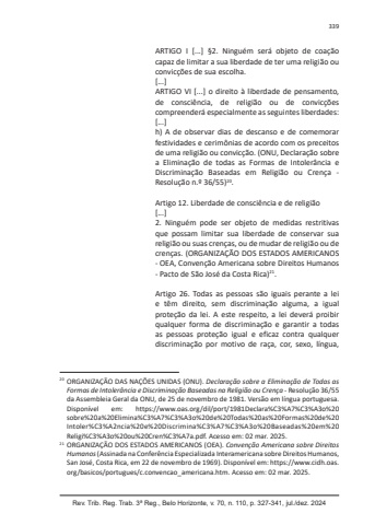 339Rev. Trib. Reg. Trab. 3ª Reg., Belo Horizonte, v. 70, n. 110, p. 327-341, jul./dez. 2024ARTIGO I [...] §2. Ninguém será objeto de coação capaz de limitar a sua liberdade de ter uma religião ou convicções de sua escolha.[...]ARTIGO VI [...] o direito à liberdade de pensamento, de consciência, de religião ou de convicções compreenderá especialmente as seguintes liberdades:[...]h) A de observar dias de descanso e de comemorar festividades e cerimônias de acordo com os preceitos de uma religião ou convicção. ( ONU, Declaração sobre a Eliminação de todas as Formas de Intolerância e Discriminação Baseadas em Religião ou Crença - Resolução n.º 36/55) 20.Artigo 12. Liberdade de consciência e de religião[...]2. Ninguém pode ser objeto de medidas restritivas que possam limitar sua liberdade de conservar sua religião ou suas crenças, ou de mudar de religião ou de crenças. ( ORGANIZAÇÃO DOS ESTADOS AMERICANOS - OEA, Convenção Americana sobre Direitos Humanos - Pacto de São José da Costa Rica) 21.Artigo 26. Todas as pessoas são iguais perante a lei e têm direito, sem discriminação alguma, a igual proteção da lei. A este respeito, a lei deverá proibir qualquer forma de discriminação e garantir a todas as pessoas proteção igual e eficaz contra qualquer discriminação por motivo de raça, cor, sexo, língua, 20 ORGANIZAÇÃO DAS NAÇÕES UNIDAS (ONU). Declaração sobre a Eliminação de Todas as Formas de Intolerância e Discriminação Baseadas na Religião ou Crença - Resolução 36/55 da Assembleia Geral da ONU, de 25 de novembro de 1981. Versão em língua portuguesa. Disponível em: https://www.oas.org/dil/port/1981Declara%C3%A7%C3%A3o%20sobre%20a%20Elimina%C3%A7%C3%A3o%20de%20Todas%20as%20Formas%20de%20Intoler%C3%A2ncia%20e%20Discrimina%C3%A7%C3%A3o%20Baseadas%20em%20Religi%C3%A3o%20ou%20Cren%C3%A7a.pdf. Acesso em: 02 mar. 2025. 21 ORGANIZAÇÃO DOS ESTADOS AMERICANOS (OEA). Convenção Americana sobre Direitos Humanos (Assinada na Conferência Especializada Interamericana sobre Direitos Humanos, San José, Costa Rica, em 22 de novembro de 1969). Disponível em: https://www.cidh.oas.org/basicos/portugues/c.convencao_americana.htm. Acesso em: 02 mar. 2025.
