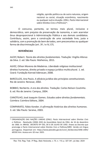 340Rev. Trib. Reg. Trab. 3ª Reg., Belo Horizonte, v. 70, n. 110, p. 327-341, jul./dez. 2024religião, opinião política ou de outra natureza, origem nacional ou social, situação econômica, nascimento ou qualquer outra situação. (ONU, Pacto Internacional sobre Direitos Civis e Políticos)22.O concurso, portanto, se tornou mais plural, inclusivo e democrático, sem prejuízo da preservação da isonomia, e sem acarretar ônus desproporcional à Administração Pública e aos demais candidatos. Contribuiu, assim, para a construção de uma sociedade livre, justa e solidária, com a promoção do bem de todos, sem preconceitos ou qualquer forma de discriminação (art. 3º, I e IV, CF).REFERÊNCIASALEXY, Robert. Teoria dos direitos fundamentais. Tradução: Virgílio Afonso da Silva. 2. ed. São Paulo: Malheiros, 2015.ALVEZ, Othon Moreno de Medeiros. Liberdade religiosa institucional: direitos humanos, direito privado e espaço jurídico multicultural. 1. ed. Ceará: Fundação Konrad Adenauer, 2008.BARCELLOS, Ana Paula. A eficácia jurídica dos princípios constitucionais. Rio de Janeiro: Renovar, 2002.BOBBIO, Norberto. A era dos direitos. Tradução: Carlos Nelson Coutinho. 6. ed. Rio de Janeiro: Campus, 2004.CANOTILHO, José Joaquim Gomes. Estudos sobre direitos fundamentais. Coimbra: Coimbra Editora, 2004.COMPARATO, Fábio Konder. A afirmação histórica dos direitos humanos. 3. ed. São Paulo: Saraiva, 2003.22 ORGANIZAÇÃO DAS NAÇÕES UNIDAS (ONU). Pacto Internacional sobre Direitos Civis e Políticos - Resolução 2200A (XXI) da Assembleia Geral da ONU, de 16 de dezembro de 1966. In: BRASIL. DECRETO Nº 592, DE 6 DE JULHO DE 1992. Anexo ao Decreto que promulga o Pacto Internacional sobre Direitos Civis e Políticos/MRE. Versão em língua portuguesa. Disponível em: https://www.planalto.gov.br/ccivil_03/decreto/1990-1994/d0592.htm. Acesso em: 02 mar. 2025.