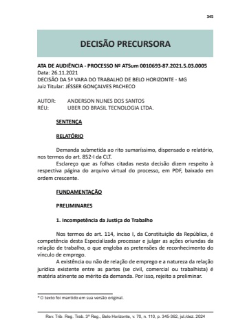 345Rev. Trib. Reg. Trab. 3ª Reg., Belo Horizonte, v. 70, n. 110, p. 345-362, jul./dez. 2024DECISÃO PRECURSORA* O texto foi mantido em sua versão original.ATA DE AUDIÊNCIA - PROCESSO Nº ATSum 0010693-87.2021.5.03.0005Data: 26.11.2021DECISÃO DA 5ª VARA DO TRABALHO DE BELO HORIZONTE - MGJuiz Titular: JÉSSER GONÇALVES PACHECOAUTOR: ANDERSON NUNES DOS SANTOSRÉU: UBER DO BRASIL TECNOLOGIA LTDA.SENTENÇARELATÓRIODemanda submetida ao rito sumaríssimo, dispensado o relatório, nos termos do art. 852-I da CLT.Esclareço que as folhas citadas nesta decisão dizem respeito à respectiva página do arquivo virtual do processo, em PDF, baixado em ordem crescente.FUNDAMENTAÇÃOPRELIMINARES1. Incompetência da Justiça do TrabalhoNos termos do art. 114, inciso I, da Constituição da República, é competência desta Especializada processar e julgar as ações oriundas da relação de trabalho, o que engloba as pretensões de reconhecimento do vínculo de emprego.A existência ou não de relação de emprego e a natureza da relação jurídica existente entre as partes (se civil, comercial ou trabalhista) é matéria atinente ao mérito da demanda. Por isso, rejeito a preliminar.