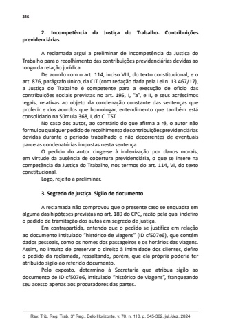 346Rev. Trib. Reg. Trab. 3ª Reg., Belo Horizonte, v. 70, n. 110, p. 345-362, jul./dez. 20242. Incompetência da Justiça do Trabalho. Contribuições previdenciáriasA reclamada argui a preliminar de incompetência da Justiça do Trabalho para o recolhimento das contribuições previdenciárias devidas ao longo da relação jurídica.De acordo com o art. 114, inciso VIII, do texto constitucional, e o art. 876, parágrafo único, da CLT (com redação dada pela Lei n. 13.467/17), a Justiça do Trabalho é competente para a execução de ofício das contribuições sociais previstas no art. 195, I, “a”, e II, e seus acréscimos legais, relativas ao objeto da condenação constante das sentenças que proferir e dos acordos que homologar, entendimento que também está consolidado na Súmula 368, I, do C. TST.No caso dos autos, ao contrário do que afirma a ré, o autor não formulou qualquer pedido de recolhimento de contribuições previdenciárias devidas durante o período trabalhado e não decorrentes de eventuais parcelas condenatórias impostas nesta sentença.O pedido do autor cinge-se à indenização por danos morais, em virtude da ausência de cobertura previdenciária, o que se insere na competência da Justiça do Trabalho, nos termos do art. 114, VI, do texto constitucional.Logo, rejeito a preliminar.3. Segredo de justiça. Sigilo de documentoA reclamada não comprovou que o presente caso se enquadra em alguma das hipóteses previstas no art. 189 do CPC, razão pela qual indefiro o pedido de tramitação dos autos em segredo de justiça.Em contrapartida, entendo que o pedido se justifica em relação ao documento intitulado “histórico de viagens” (ID cf507e6), que contém dados pessoais, como os nomes dos passageiros e os horários das viagens. Assim, no intuito de preservar o direito à intimidade dos clientes, defiro o pedido da reclamada, ressaltando, porém, que ela própria poderia ter atribuído sigilo ao referido documento.Pelo exposto, determino à Secretaria que atribua sigilo ao documento de ID cf507e6, intitulado “histórico de viagens”, franqueando seu acesso apenas aos procuradores das partes.