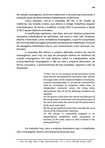 349Rev. Trib. Reg. Trab. 3ª Reg., Belo Horizonte, v. 70, n. 110, p. 345-362, jul./dez. 2024de relação empregatícia, de forma modernizar o conceito para promover a proteção social de determinados trabalhadores autônomos.Como exemplo, cita-se a Assembly Bill No. 5 do Estado da Califórnia, nos Estados Unidos, que alterou o Código Trabalhista daquele ente federativo, de forma a modificar a Seção 3351 e acrescentar a Seção 2750.3 àquele diploma normativo.A modificação legislativa, vale dizer, teve por objetivo justamente enquadrar trabalhadores de aplicativos, tais como o Uber, Lyft, GrubHub, Washio e Doordash, como verdadeiros empregados, o que foi conquistado por meio de lobby de órgãos associados à proteção do trabalhador, inclusive de advogados trabalhistas (cita-se, por merecimento, a Dra. Shannon LissRiordan).A Assembly Bill alterou a própria definição jurídica de vínculo empregatício, para criar um tipo de presunção relativa de existência de relação empregatícia. Por este diploma, todos os trabalhadores serão presumidamente empregados, a não ser que a empresa demonstre, de forma cumulativa, o preenchimento de três condições. Vejamos o teor da disposição:“2750.3. (a) (1) For purposes of the provisions of this code and the Unemployment Insurance Code, and for the wage orders of the Industrial Welfare Commission, a person providing labor or services for remuneration shall be considered an employee rather than an independent contractor unless the hiring entity demonstrates that all of the following conditions are satisfied:(A) The person is free from the control and direction of the hiring entity in connection with the performance of the work, both under the contract for the performance of the work and in fact.(B) The person performs work that is outside the usual course of the hiring entity’s business.(C) The person is customarily engaged in an independently established trade, occupation, or business of the same nature as that involved in the work performed.”Em tradução livre, para a empresa demonstrar que o trabalhador não é empregado, deverá cumulativamente provar que: