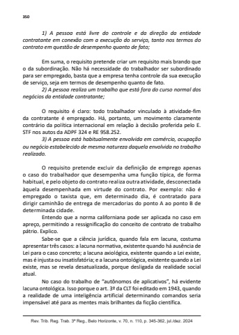 350Rev. Trib. Reg. Trab. 3ª Reg., Belo Horizonte, v. 70, n. 110, p. 345-362, jul./dez. 20241) A pessoa está livre do controle e da direção da entidade contratante em conexão com a execução do serviço, tanto nos termos do contrato em questão de desempenho quanto de fato;Em suma, o requisito pretende criar um requisito mais brando que o da subordinação. Não há necessidade do trabalhador ser subordinado para ser empregado, basta que a empresa tenha controle da sua execução de serviço, seja em termos de desempenho quanto de fato.2) A pessoa realiza um trabalho que está fora do curso normal dos negócios da entidade contratante;O requisito é claro: todo trabalhador vinculado à atividade-fim da contratante é empregado. Há, portanto, um movimento claramente contrário da política internacional em relação à decisão proferida pelo E. STF nos autos da ADPF 324 e RE 958.252.3) A pessoa está habitualmente envolvida em comércio, ocupação ou negócio estabelecido de mesma natureza daquela envolvida no trabalho realizado.O requisito pretende excluir da definição de emprego apenas o caso do trabalhador que desempenha uma função típica, de forma habitual, e pelo objeto do contrato realiza outra atividade, desconectada àquela desempenhada em virtude do contrato. Por exemplo: não é empregado o taxista que, em determinado dia, é contratado para dirigir caminhão de entrega de mercadorias do ponto A ao ponto B de determinada cidade.Entendo que a norma californiana pode ser aplicada no caso em apreço, permitindo a ressignificação do conceito de contrato de trabalho pátrio. Explico.Sabe-se que a ciência jurídica, quando fala em lacuna, costuma apresentar três casos: a lacuna normativa, existente quando há ausência de Lei para o caso concreto; a lacuna axiológica, existente quando a Lei existe, mas é injusta ou insatisfatória; e a lacuna ontológica, existente quando a Lei existe, mas se revela desatualizada, porque desligada da realidade social atual.No caso do trabalho de “autônomos de aplicativos”, há evidente lacuna ontológica. Isso porque o art. 3º da CLT foi editado em 1943, quando a realidade de uma inteligência artificial determinando comandos seria impensável até para as mentes mais brilhantes da ficção científica.