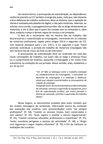 354Rev. Trib. Reg. Trab. 3ª Reg., Belo Horizonte, v. 70, n. 110, p. 345-362, jul./dez. 2024Da mesma forma, o pressuposto da subordinação, ou dependência, conforme previsto na CLT, também emerge dos autos, visto que, não obstante a tese defensiva de trabalho autônomo, deve-se destacar que a captação do cliente é realizada pela plataforma digital, e não pelo motorista. Ademais, ao solicitar uma corrida, o passageiro/consumidor não se dirige diretamente ao motorista, e sim à Uber, que é quem faz contato com os motoristas e, além disso, estipula o preço e demais regras do serviço a ser prestado.O fato de o reclamante não ter horário fixo de trabalho não descaracteriza a subordinação ao empregador, mormente em se tratando de motorista profissional, regido pelos artigos 235-A e seguintes da CLT, com especial destaque para o art. 235-C, § 13, segundo o qual “Salvo previsão contratual, a jornada de trabalho do motorista empregado não tem horário fixo de início, de final ou de intervalos”.O pressuposto da subordinação deve ser analisado em vista das novas concepções de trabalho, nas quais não se exige a presença física ou o cumprimento de horários, passando o empregado a ter muito mais autonomia na condução da sua jornada. Nesse sentido, aliás, estabelece o art. 6º da CLT:“Art. 6º Não se distingue entre o trabalho realizado no estabelecimento do empregador, o executado no domicílio do empregado e o realizado a distância, desde que estejam caracterizados os pressupostos da relação de emprego.Parágrafo único. Os meios telemáticos e informatizados de comando, controle e supervisão se equiparam, para fins de subordinação jurídica, aos meios pessoais e diretos de comando, controle e supervisão do trabalho alheio.”Nesse ângulo, os documentos juntados pelo autor revelam que ele recebia mensagens da reclamada, informando acerca do conteúdo das avaliações dos usuários, com recomendações como “ser sempre profissional” (fl. 50), “manter os veículos limpos, bem conservados e sem odores” (fl. 37), “lavar, aspirar e ventilar o veículo regularmente” (fl. 35), “manter conversas educadas, profissionais e respeitosas” (fl. 37), “evitar manobras perigosas e excesso de velocidade” (fl. 48), e “dirigir com segurança e seguir trajetos eficientes” (fl. 70), a fim de melhorar as avaliações dos usuários.